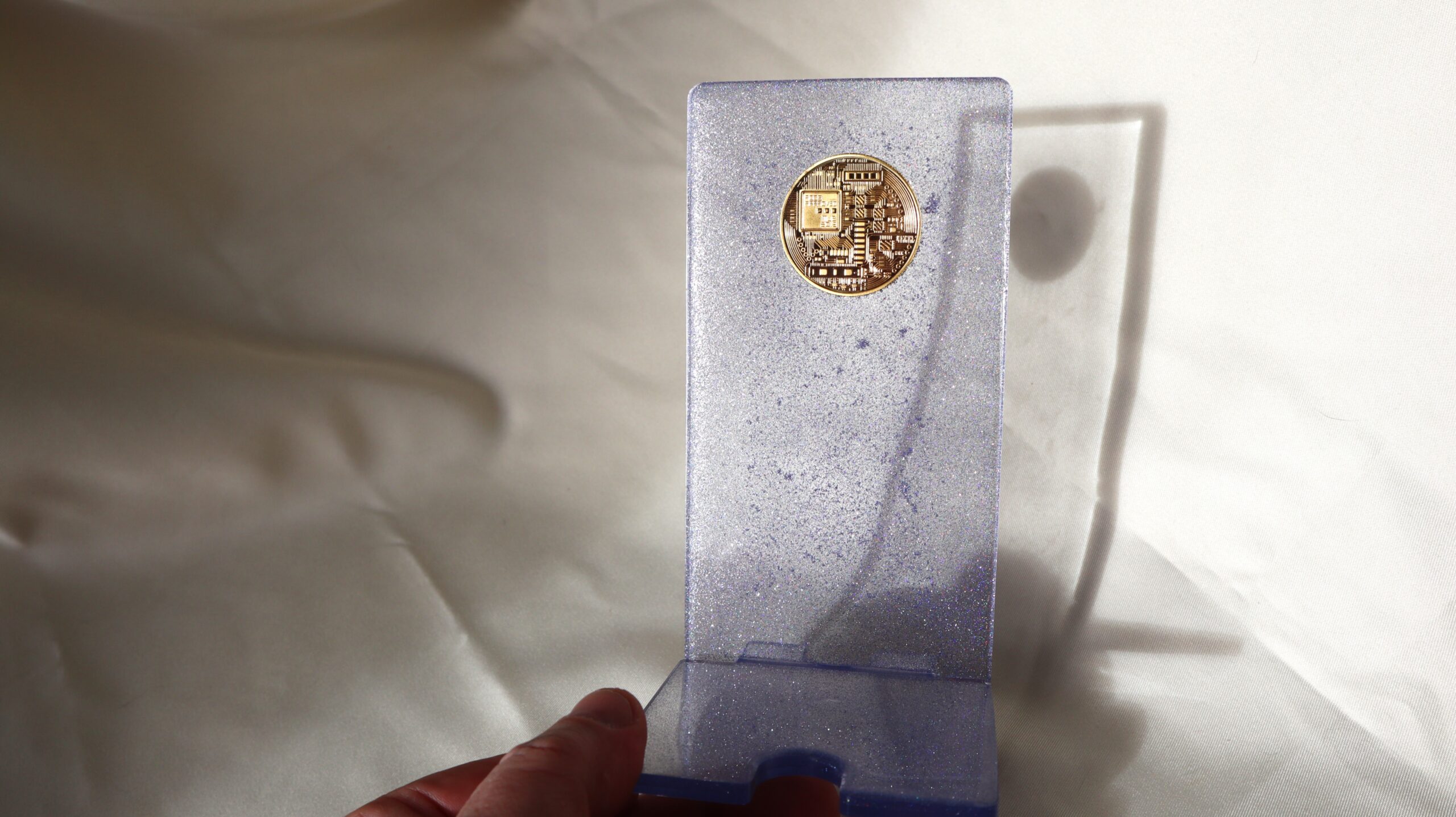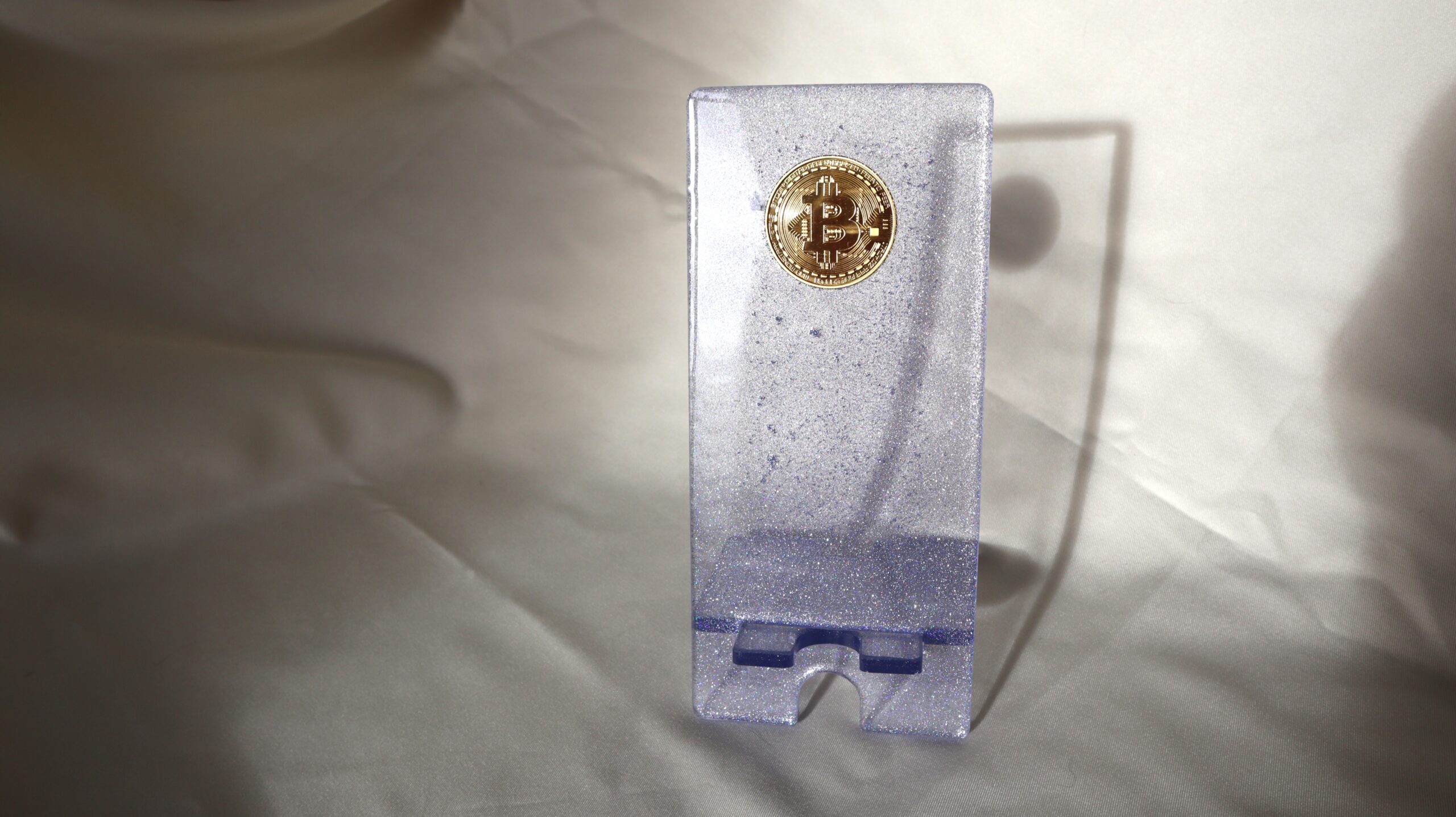 “Bitcoin Crystal” is a handmade epoxy resin phone holder with a translucent effect and shiny particles, complemented by a decorative insert with a Bitcoin symbol in a gold finish.
