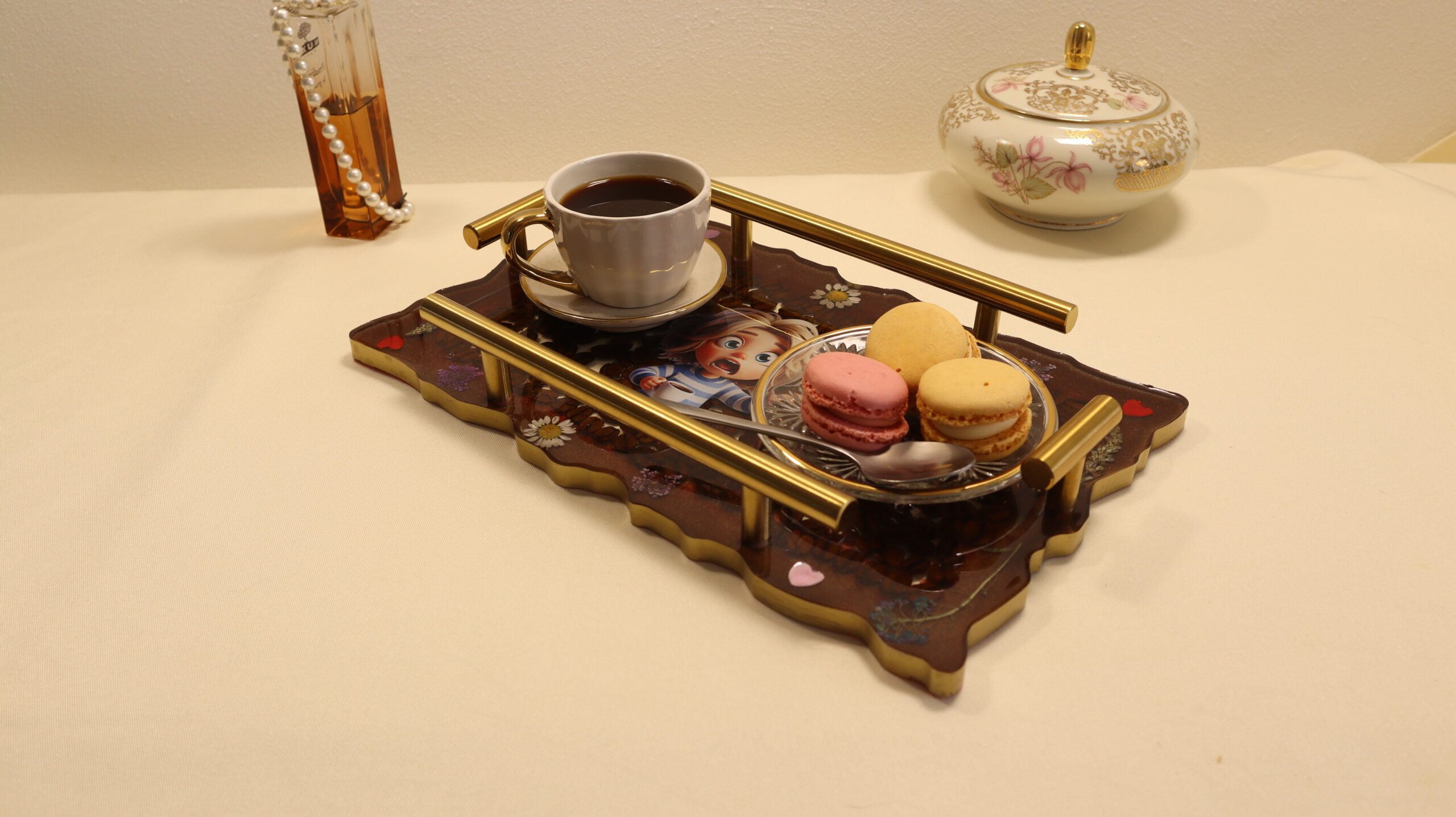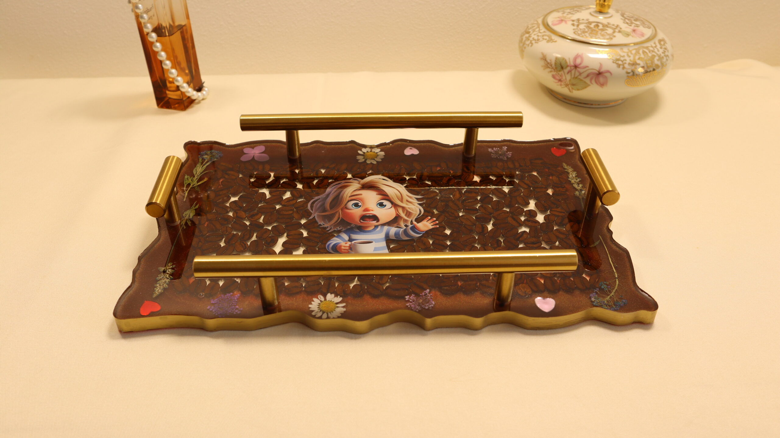Decorative tray handmade from epoxy resin, with a warm and expressive design, inspired by the love of coffee and cozy moments. The background is composed of coffee beans, and the central element brings an artistic and playful touch, transforming the tray into a unique and memorable piece.