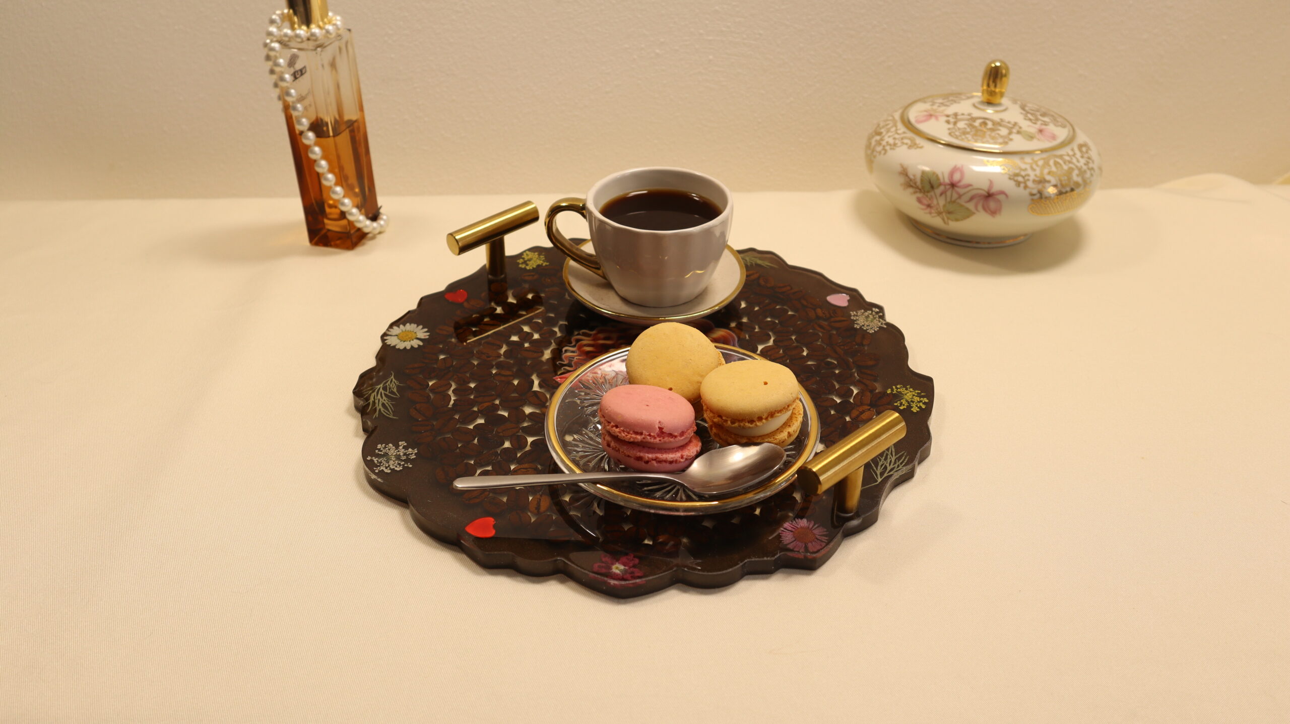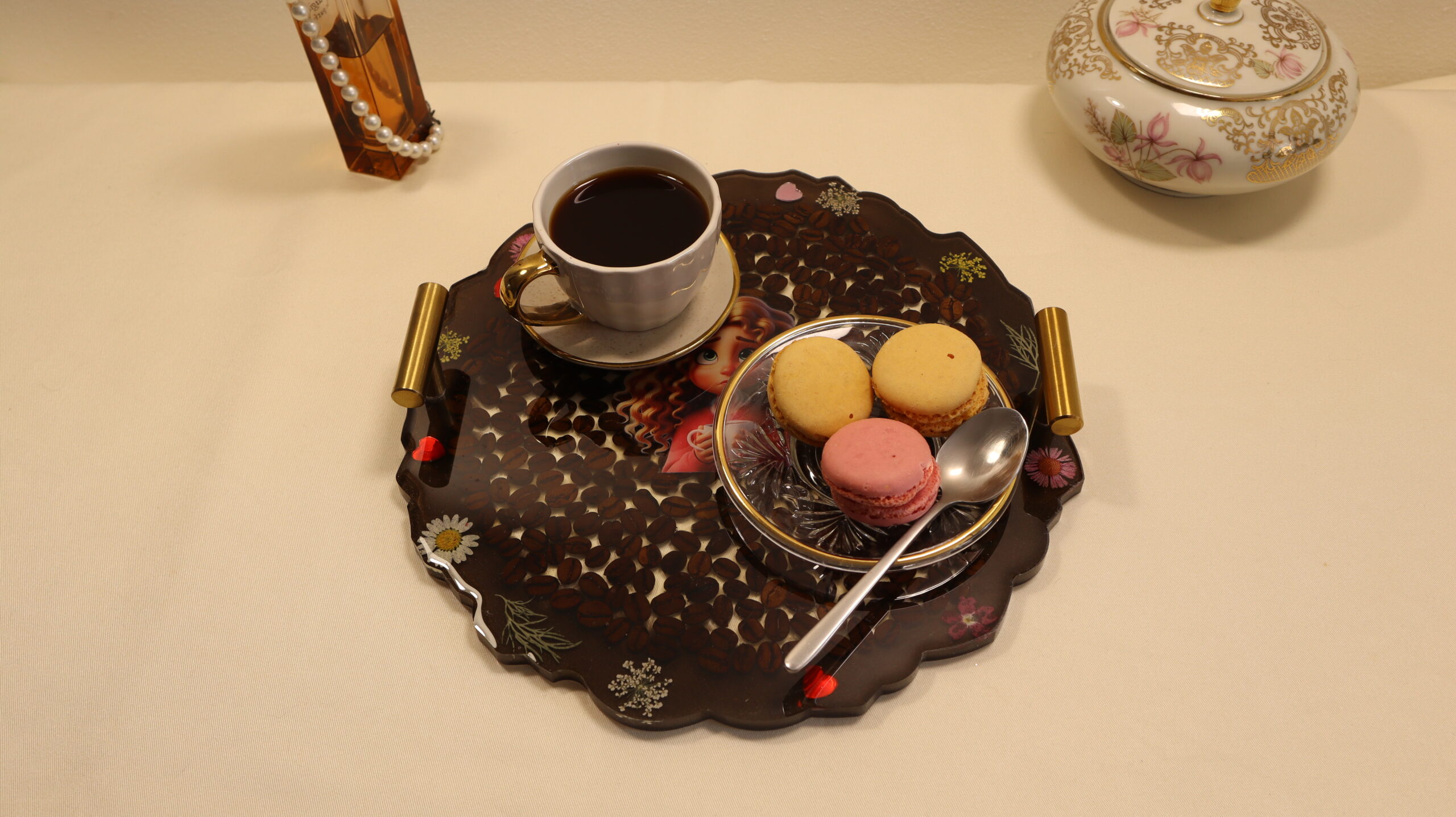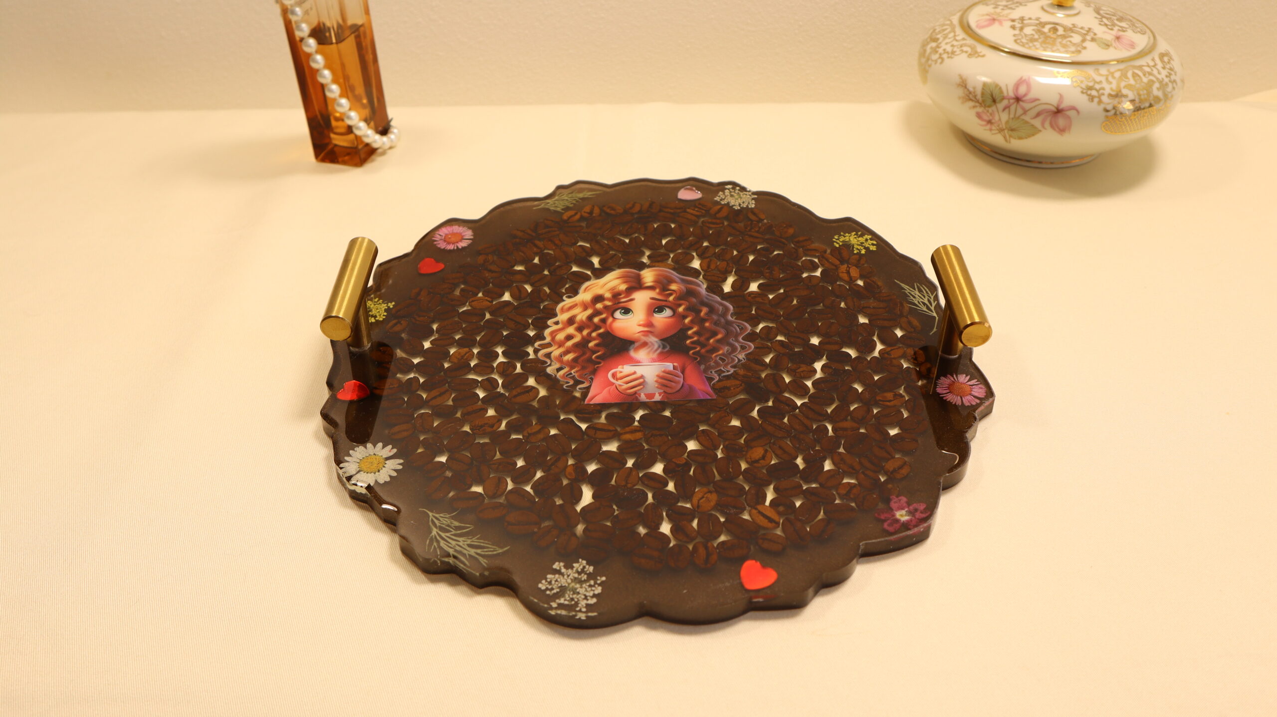 Add a touch of warmth and sophistication to your space with this unique, handmade epoxy resin decorative tray. The design is enriched with natural coffee beans, delicate flowers and decorative accents, and in the center is a charming illustration of a little girl with a cup of coffee, which conveys a sense of comfort and tranquility.