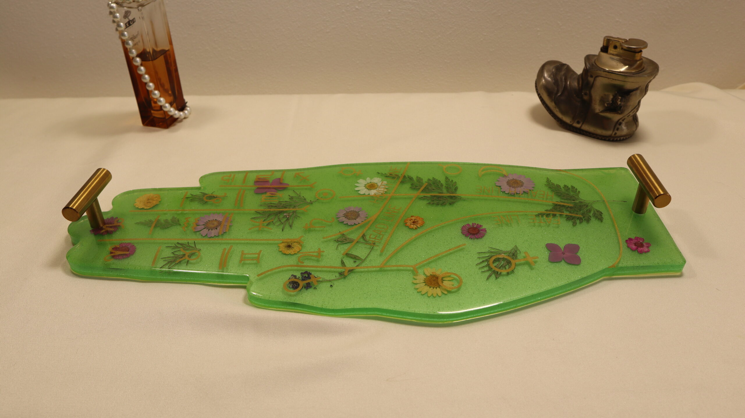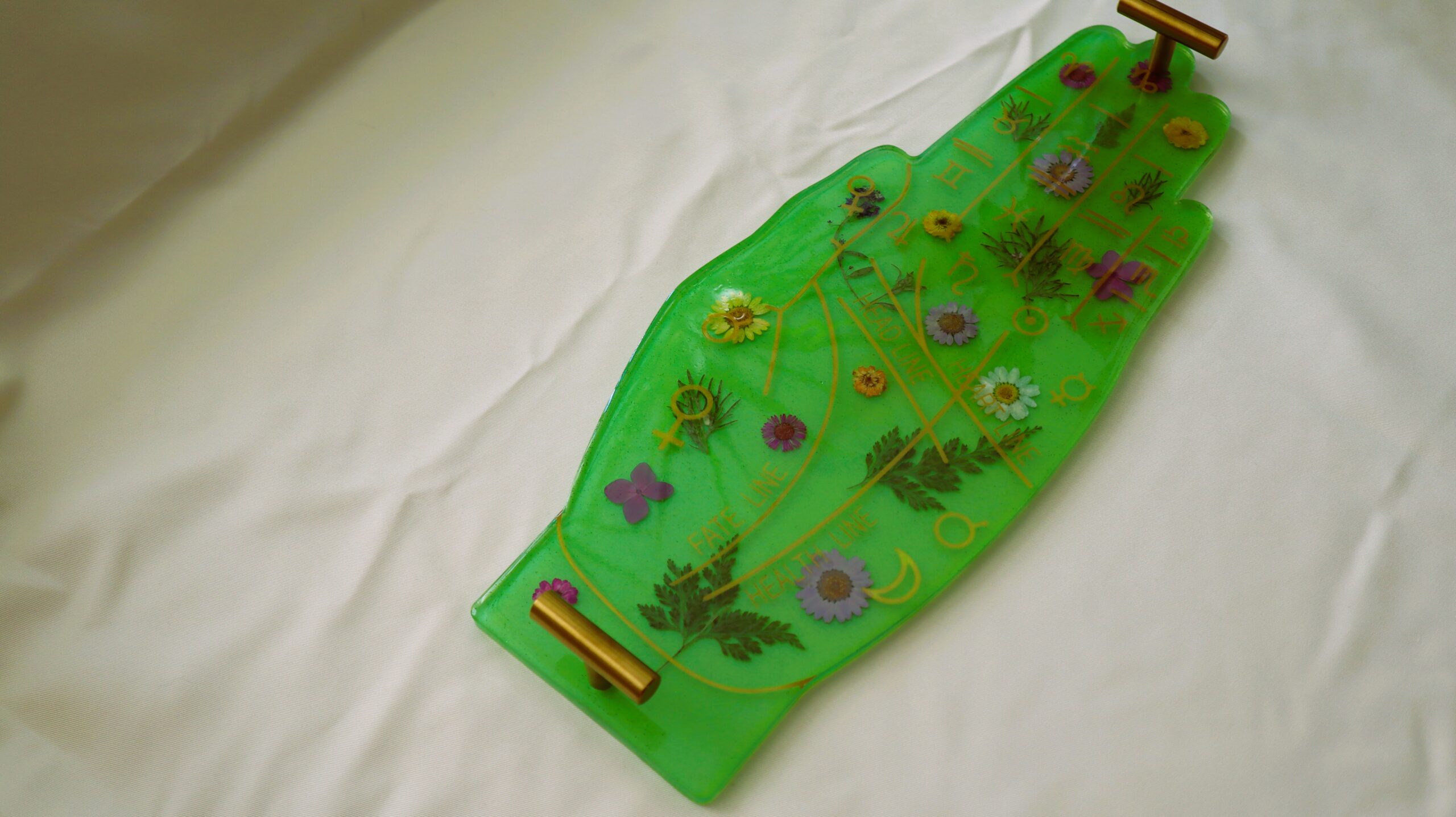 Decorative tray handmade from epoxy resin, with pressed natural flowers and leaves, integrated into a symbolic design inspired by palmistry, astrology and mystical elements. The translucent green background offers depth and freshness, highlighting the botanical details and the golden engraving of the lines and symbols.