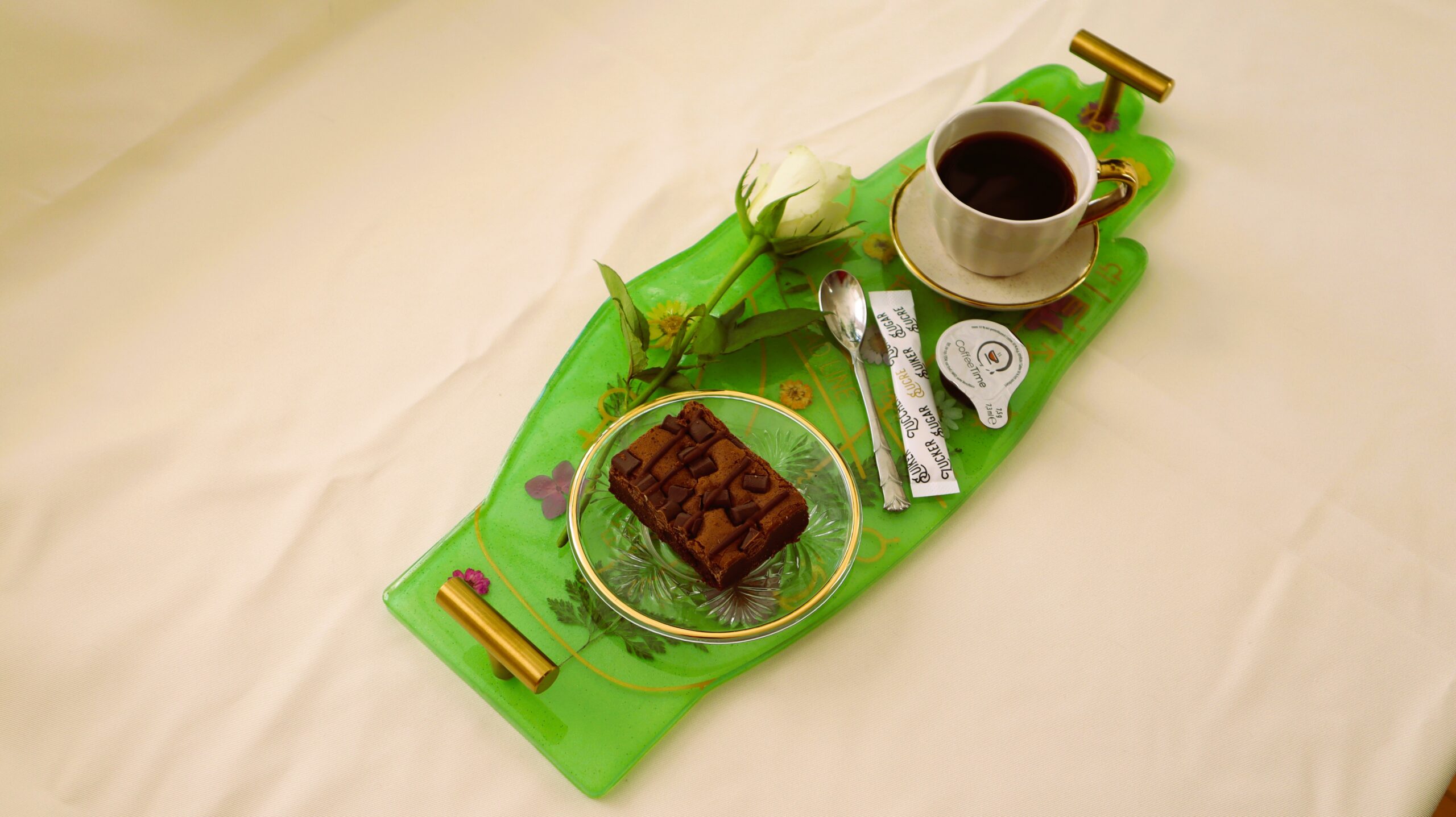The wavy edges and golden metal handles complete the design with an elegant and modern accent.