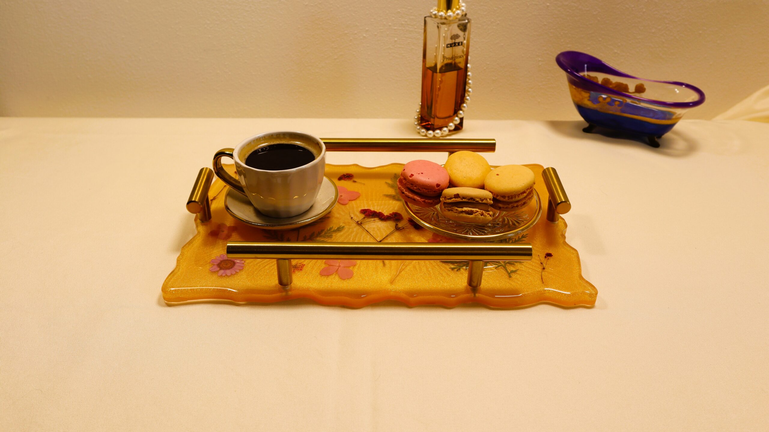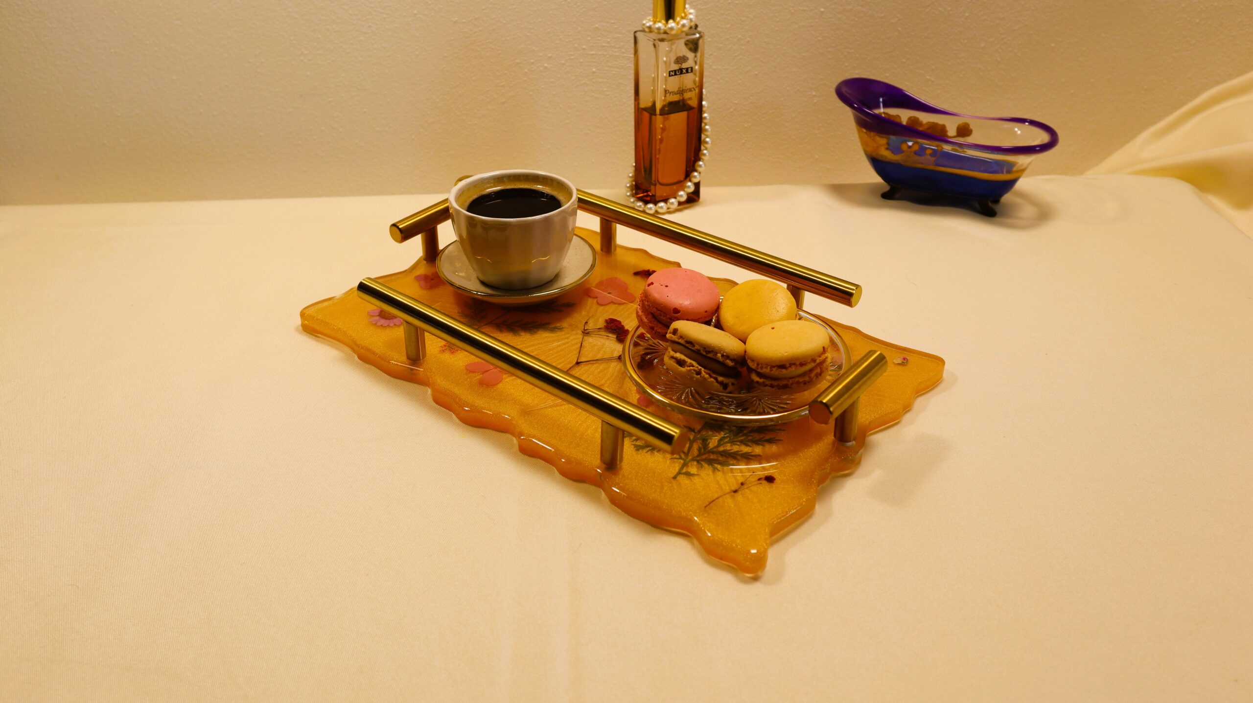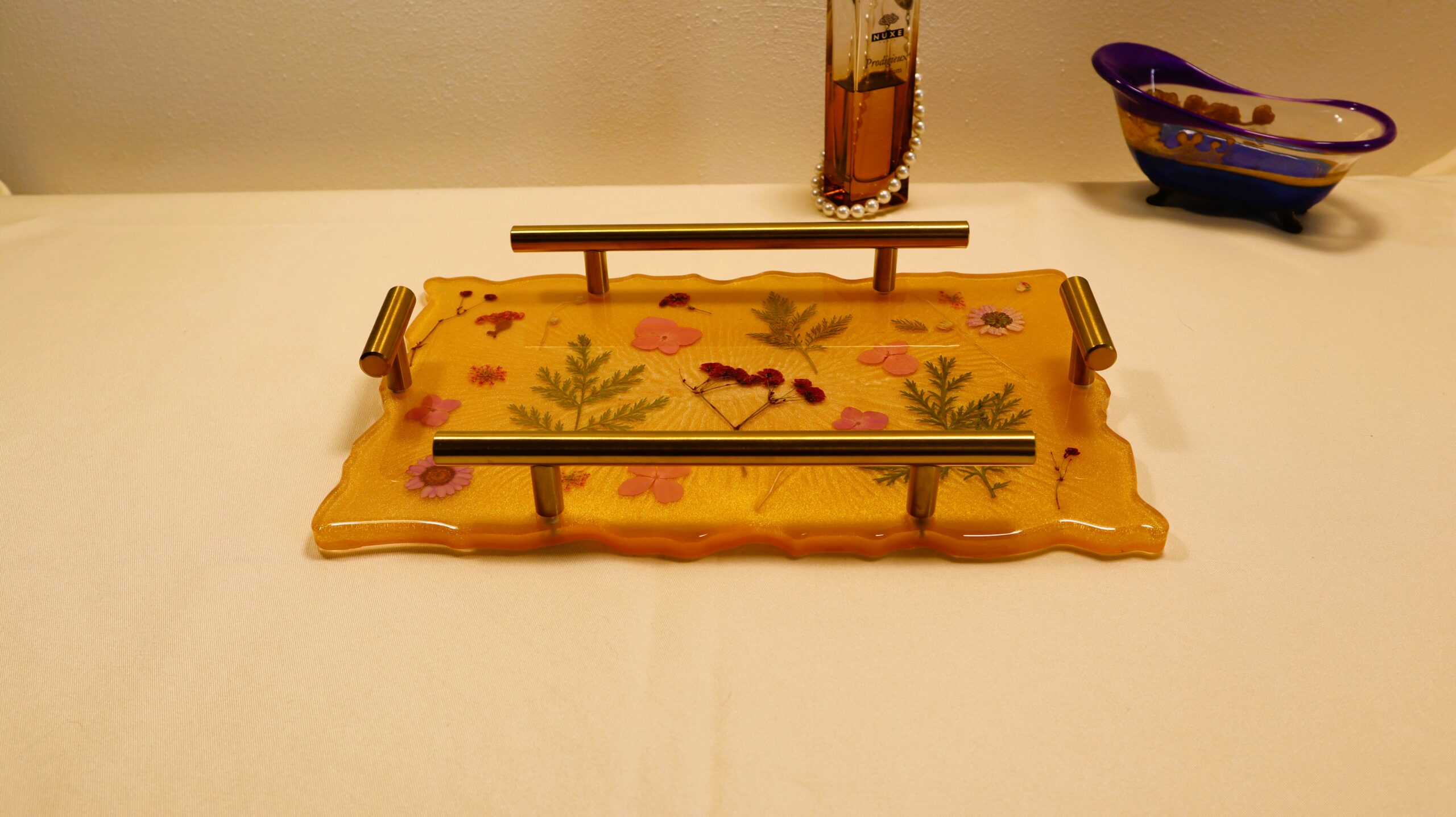 This handmade epoxy tray is a unique decorative piece, made with real pressed flowers and botanical elements. The warm amber tone highlights each floral detail, while the elegant gold handles add a touch of luxury and functionality.