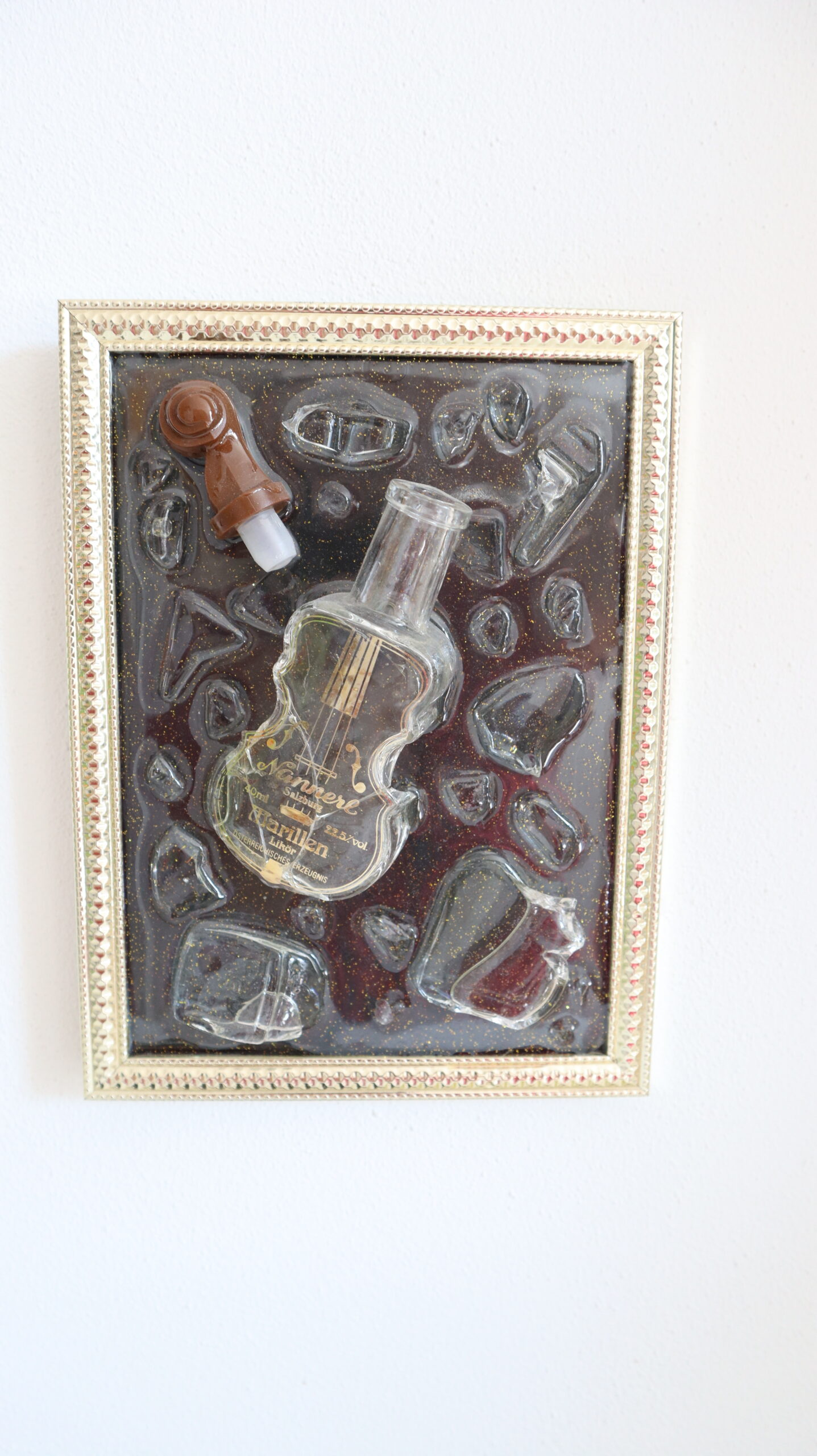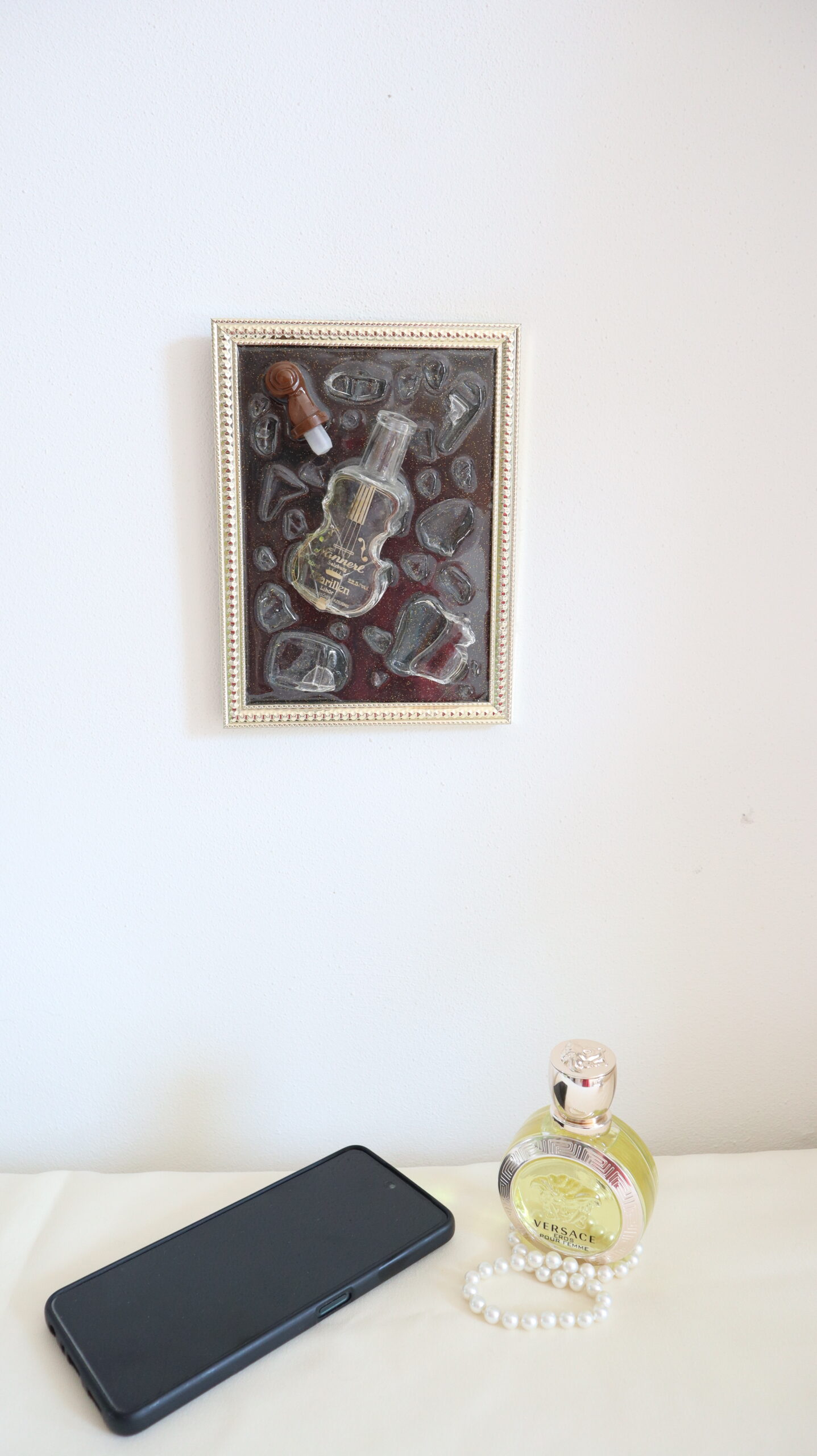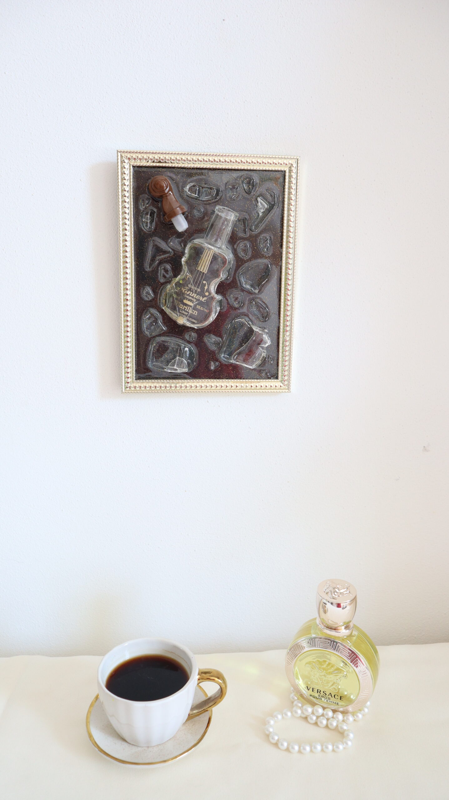 This unique decorative painting is handmade from artistic resin, integrating glass fragments and a mini decorative container in the shape of a violin, a central element that symbolizes music, emotion and the fragility of art. The three-dimensional composition creates depth and subtle plays of light, transforming the painting into a statement piece.