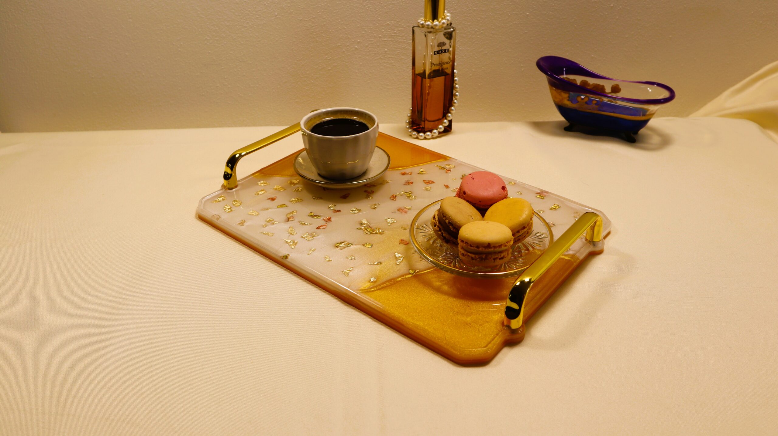 This exquisite epoxy resin tray is handmade and impresses with its sophisticated combination of pearlescent white and warm gold tones. Accents of gold and copper metal foil create a luxurious effect, with delicate reflections that change depending on the light.