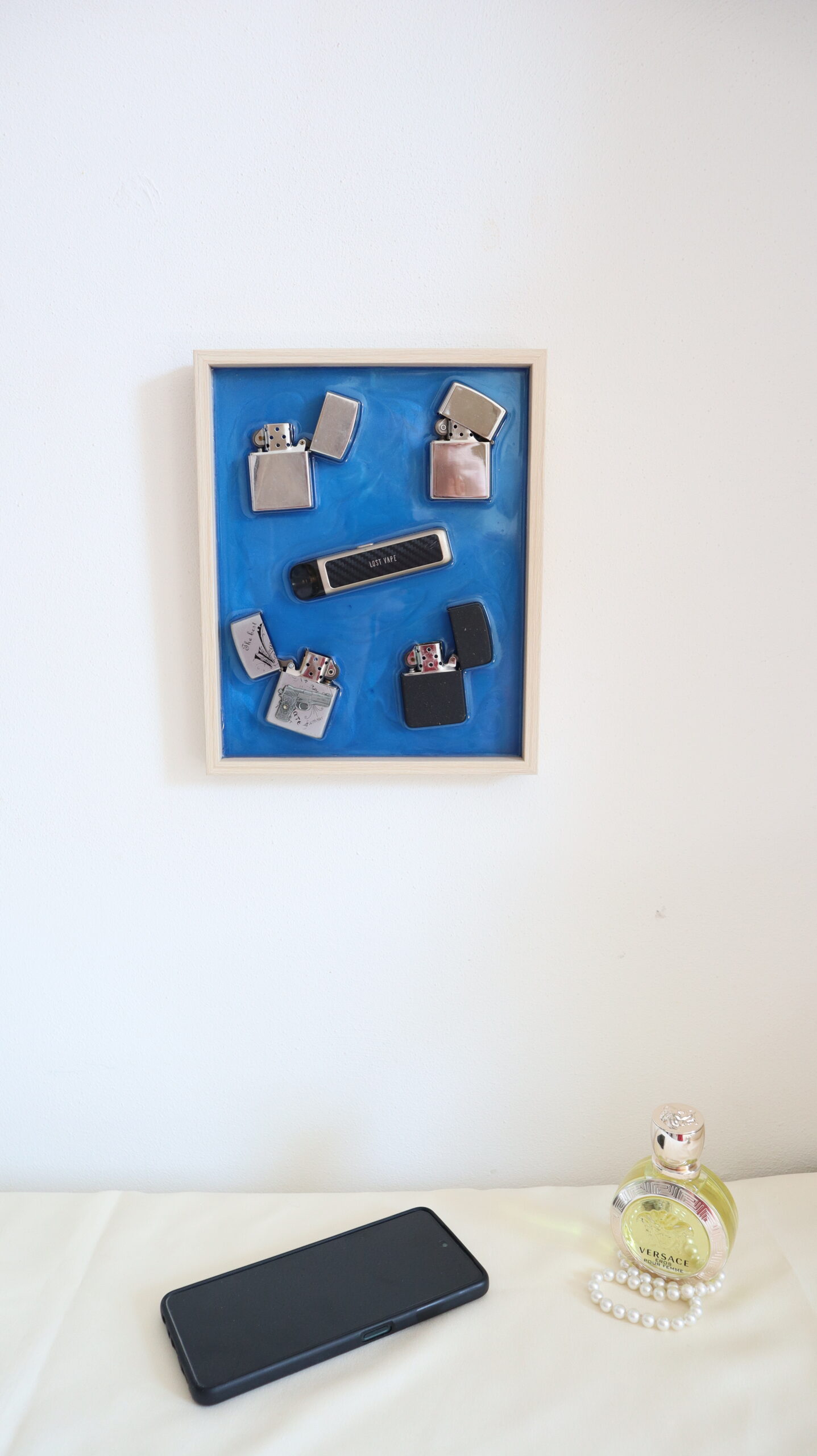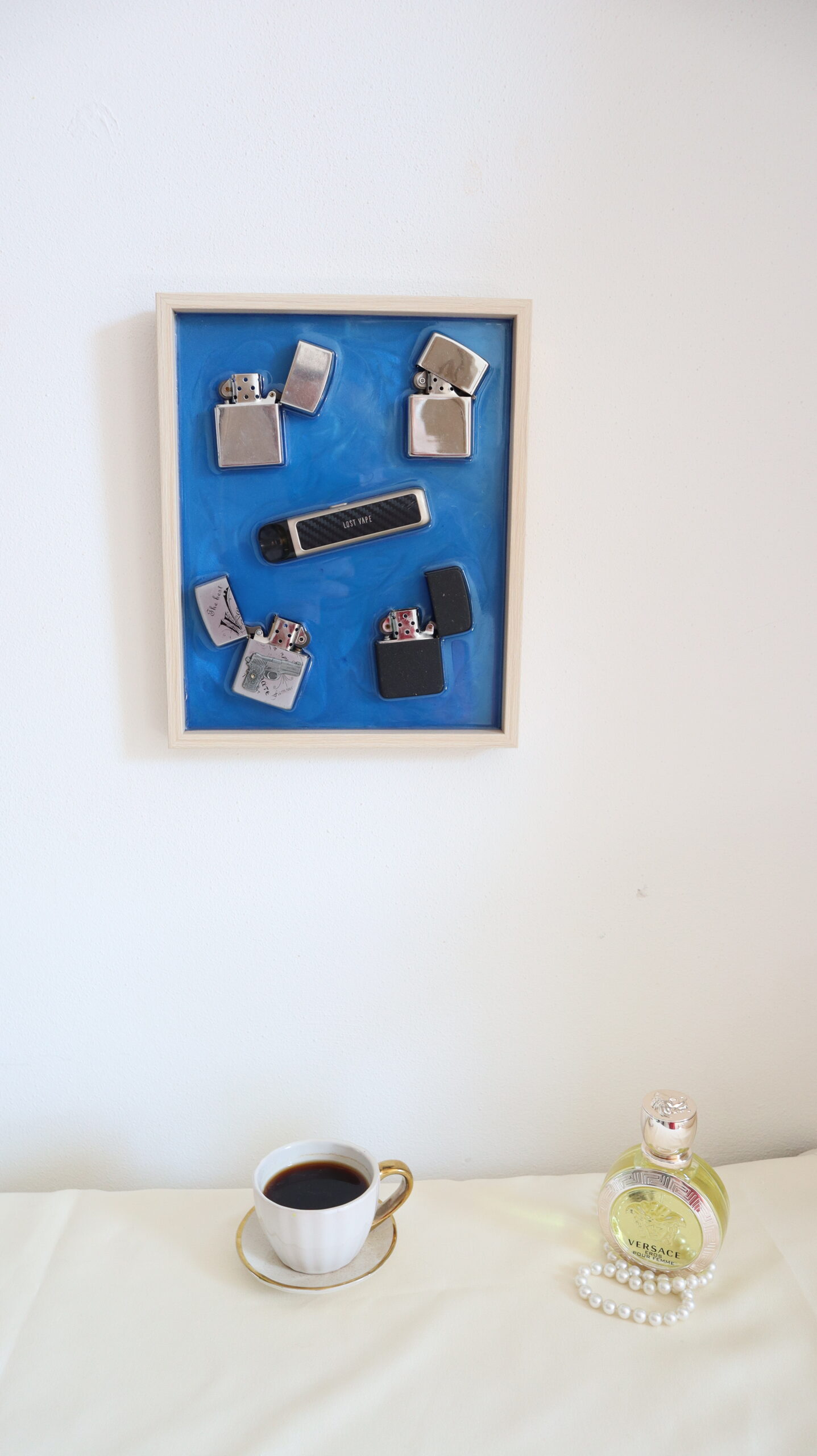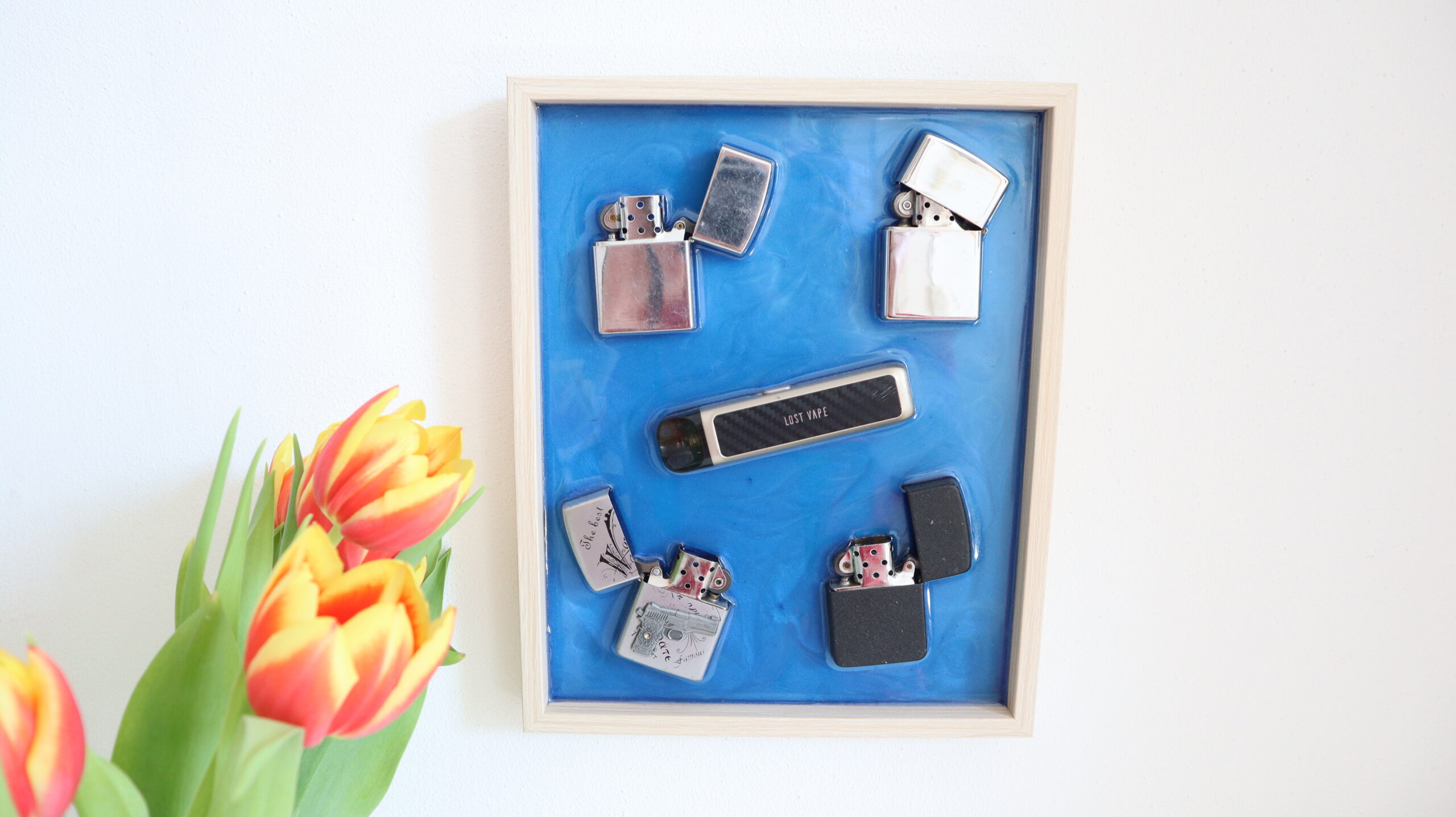 This unique decorative painting combines contemporary design with industrial elements, being handmade from deep blue epoxy resin, in which Zippo lighters and a vape device are embedded. The natural wood frame offers a pleasant contrast and a premium look, transforming the piece into a strong visual accent.