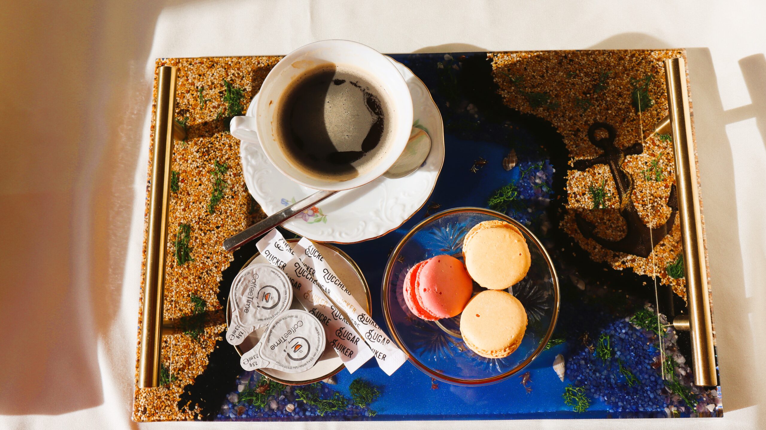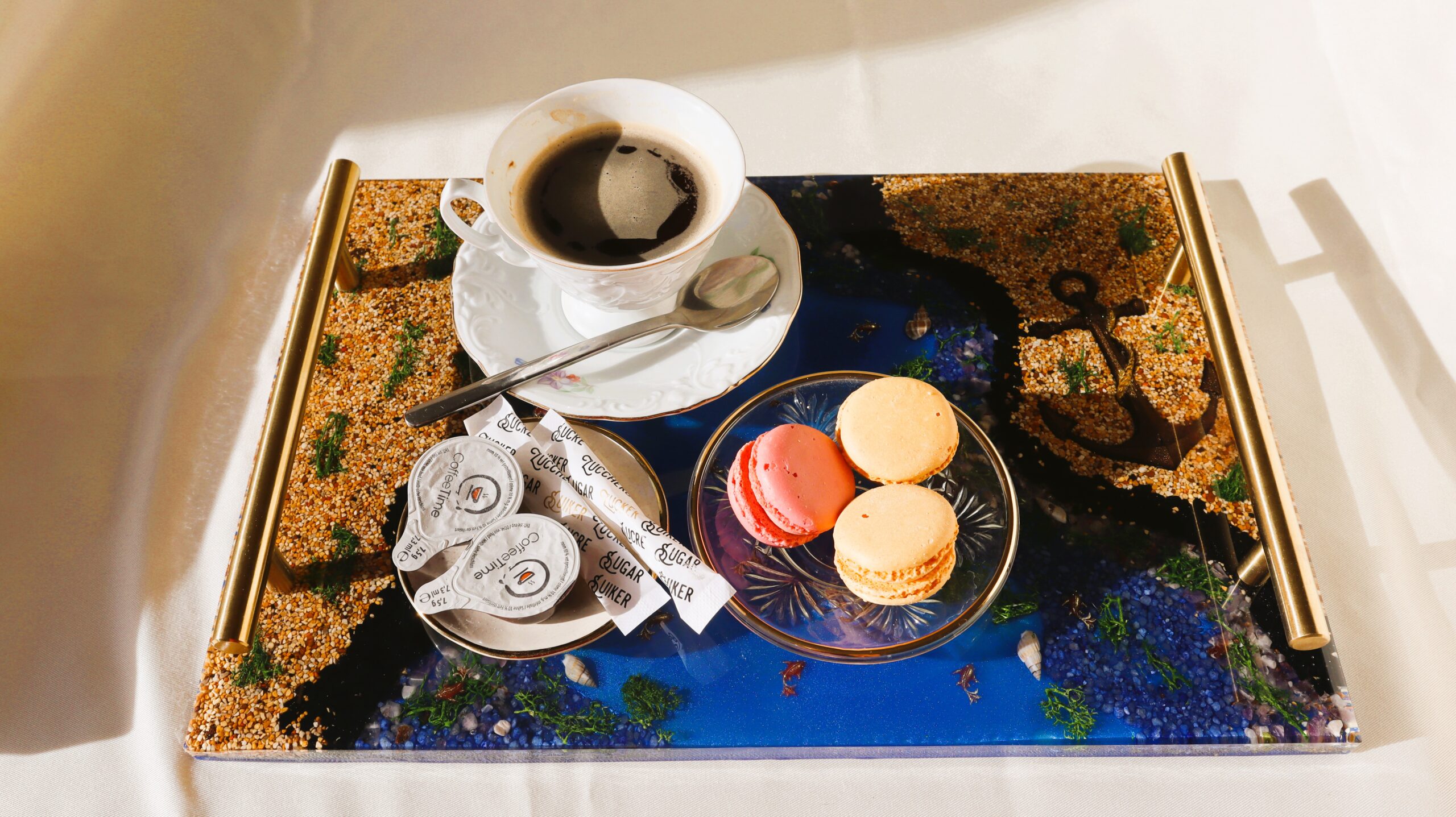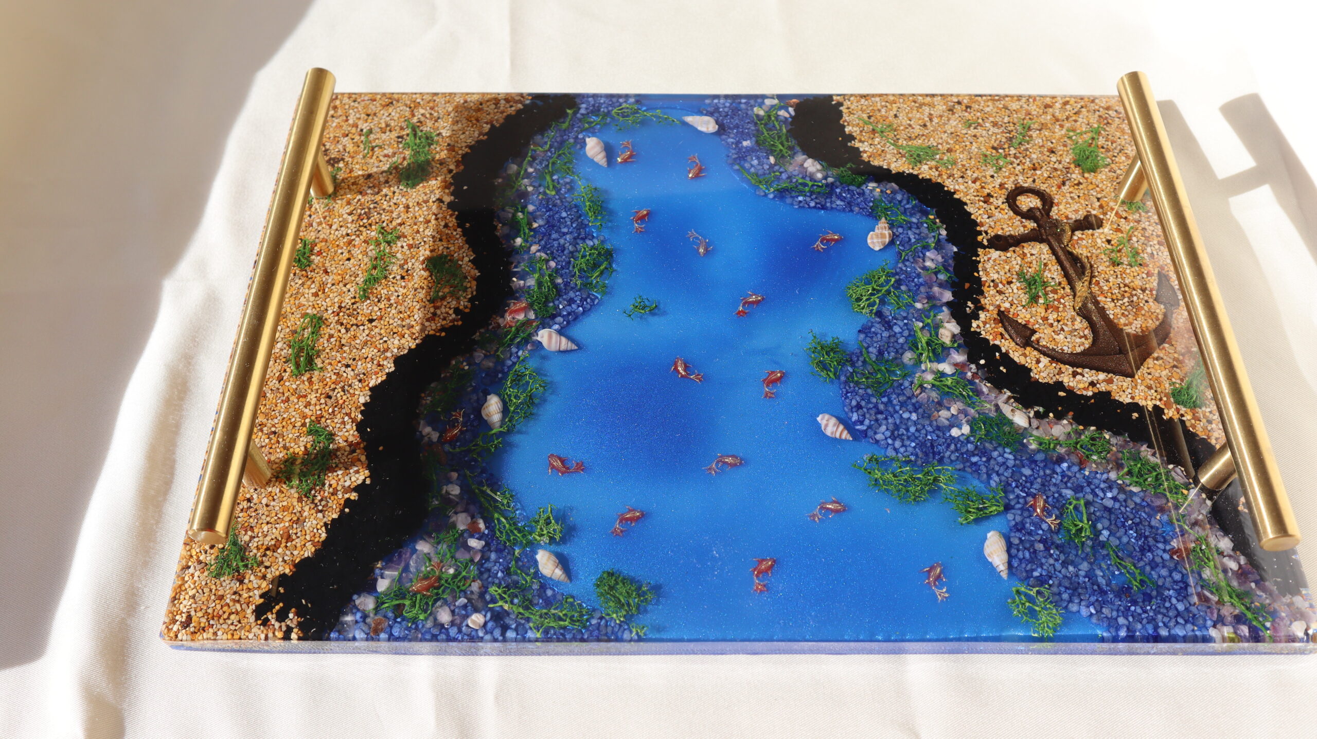 “Marine Story” is a handmade decorative tray made of epoxy resin, inspired by the tranquility of the water and the beauty of marine details, the tranquility of the sea and the charm of wild shores.