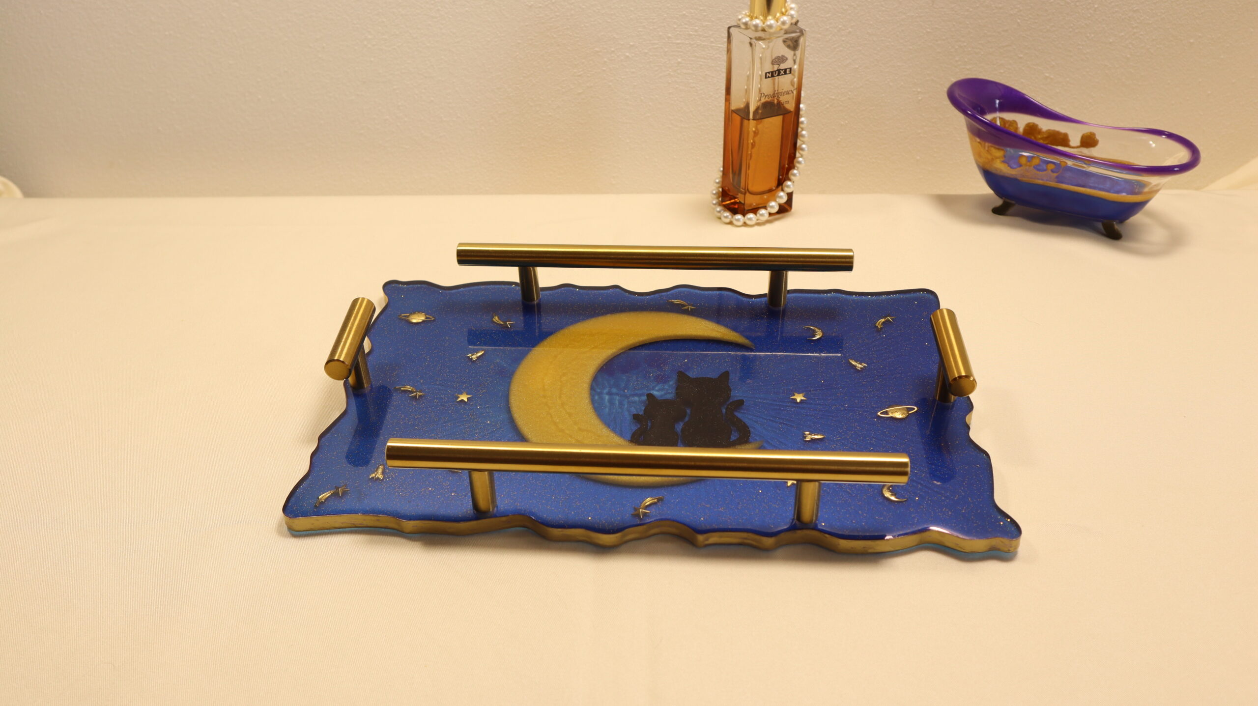 Handmade decorative tray made of epoxy resin, inspired by the magic of clear nights. The design captures two silhouettes of cats sitting on a golden crescent moon, in a deep blue sky, sprinkled with stars and astral symbols.