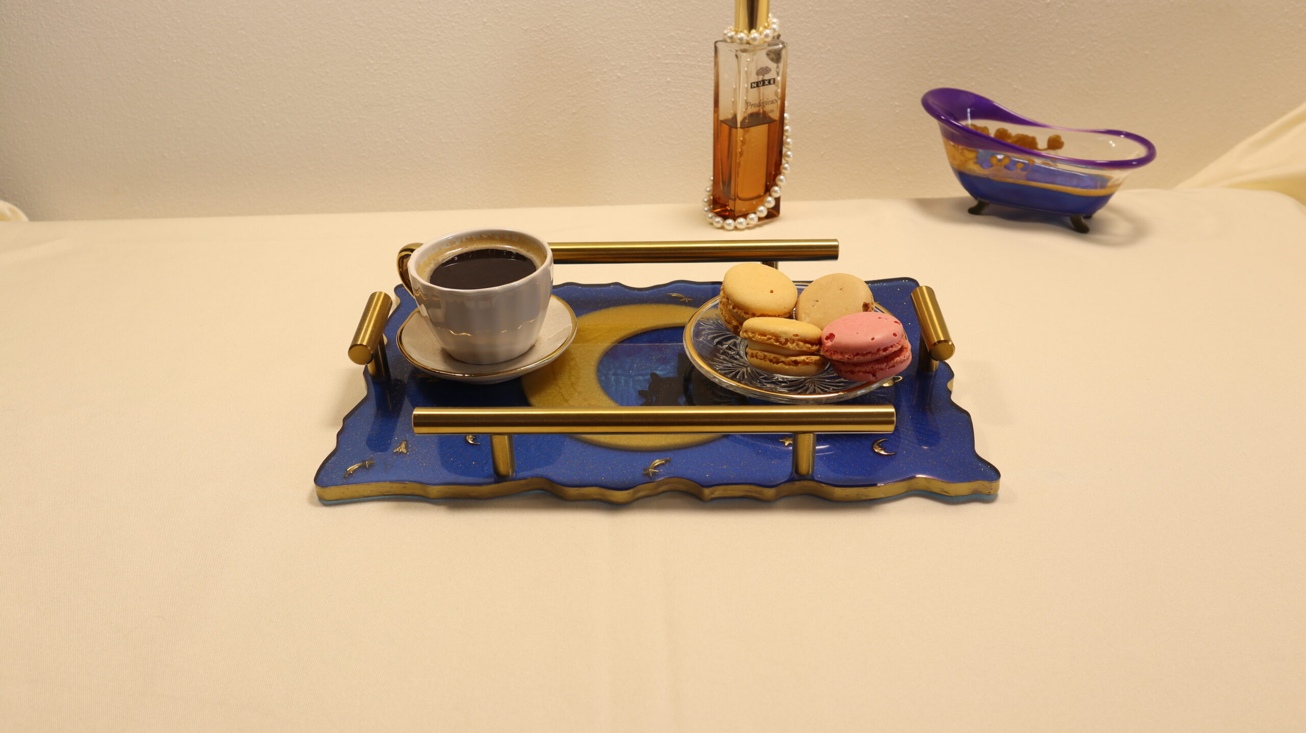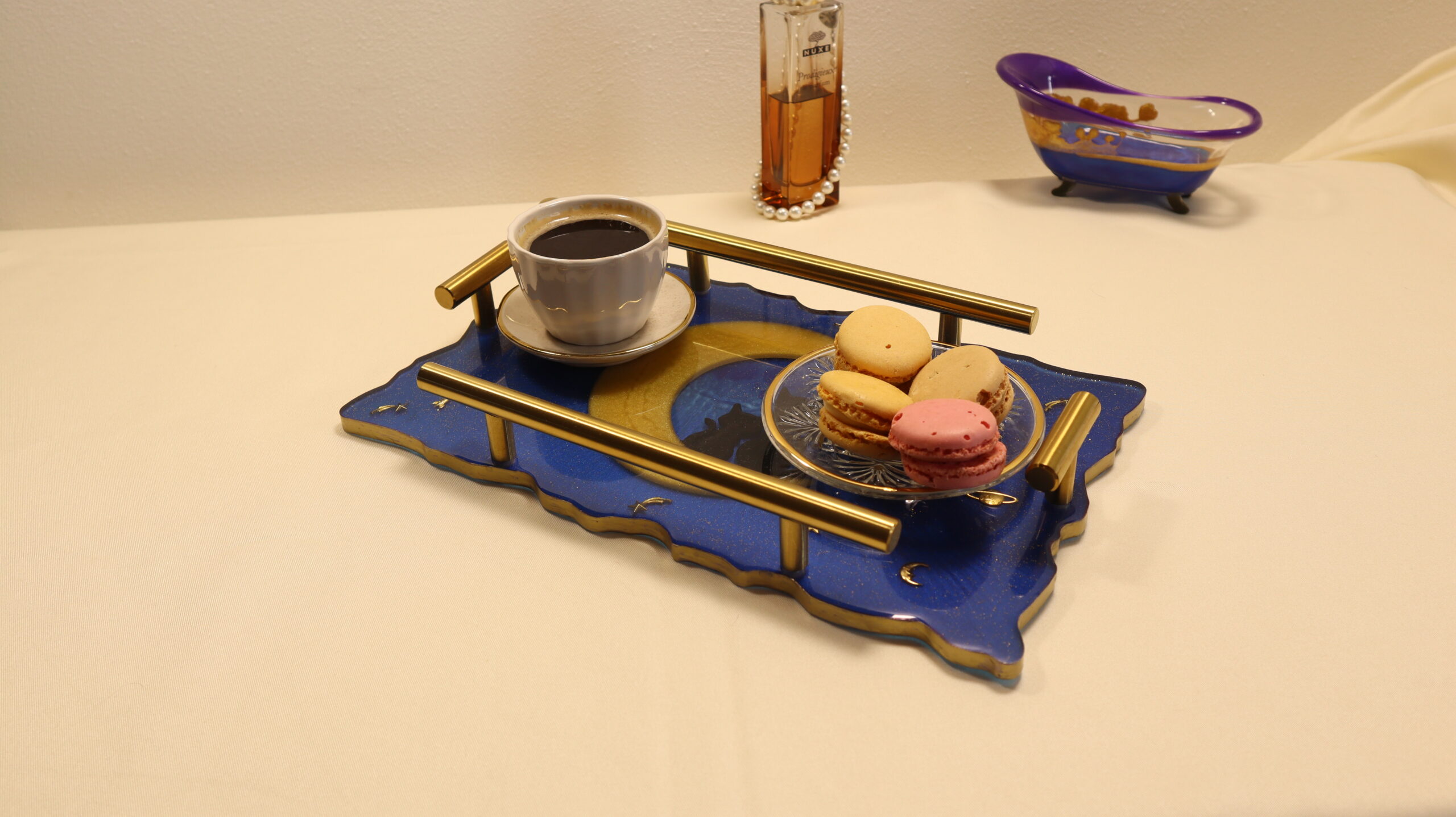 The golden metal details and elegant handles complete the refined look, transforming the tray into a statement piece, ideal for modern or romantic interiors.
