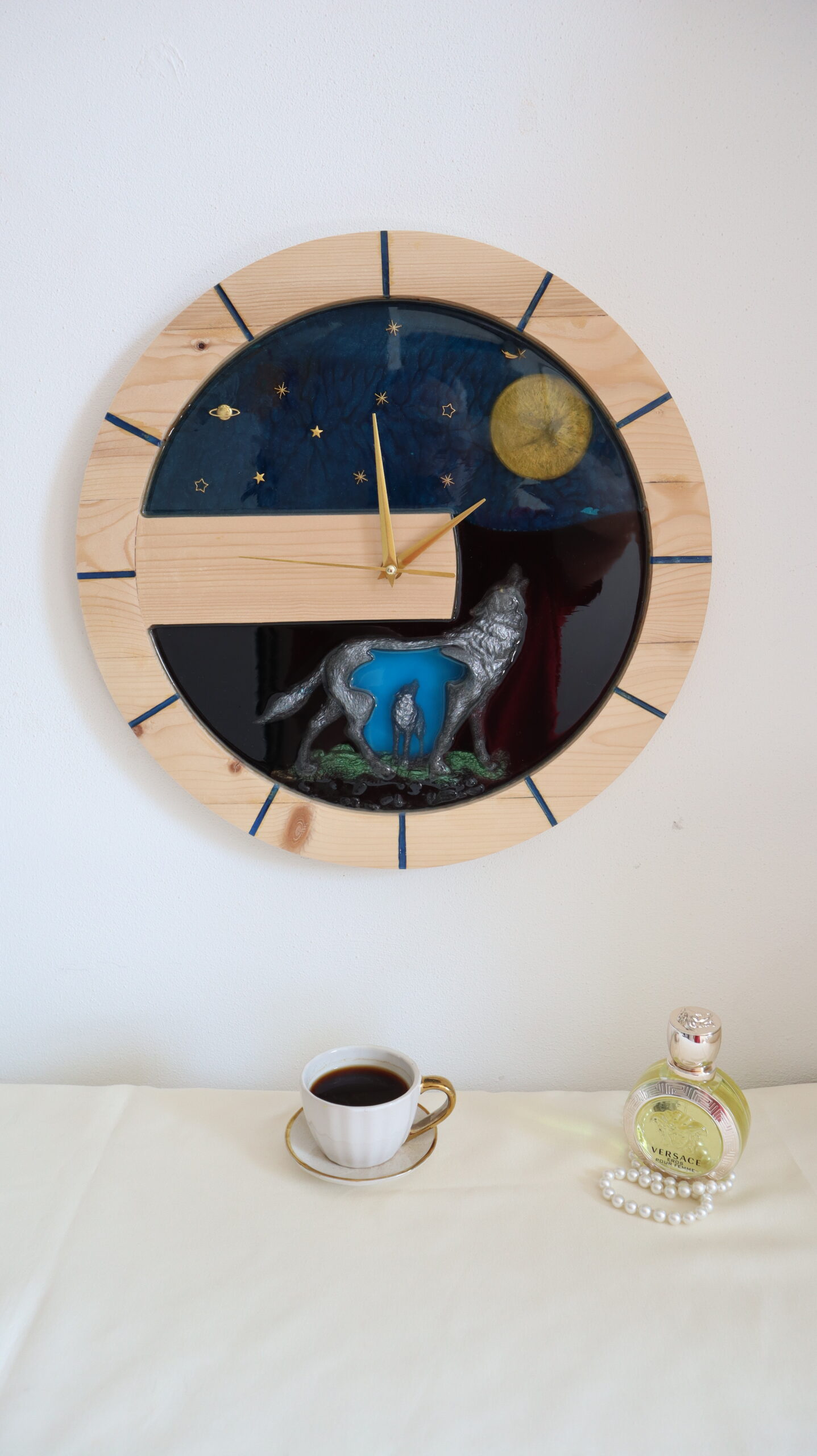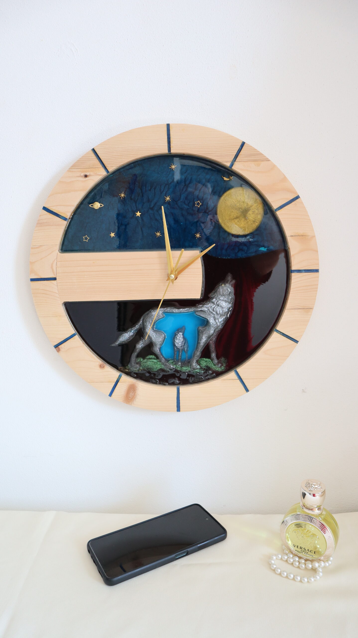 This handmade wall clock made of natural wood and epoxy resin is a spectacular decorative piece, inspired by the strength and mystery of wild nature. The design depicts an impressive night scene, with wolves under the full moon, highlighted by sculptural details and deep color contrasts.