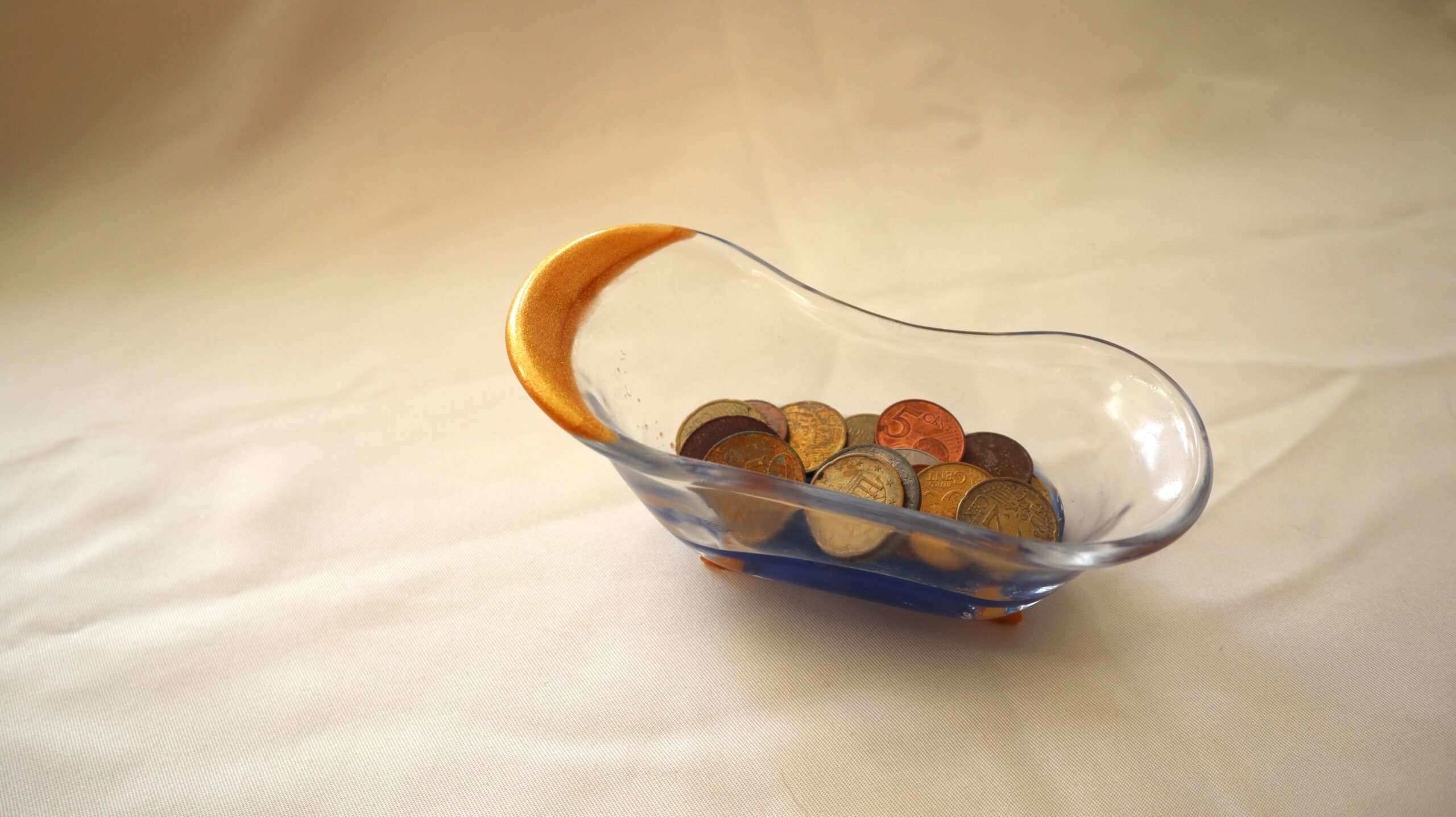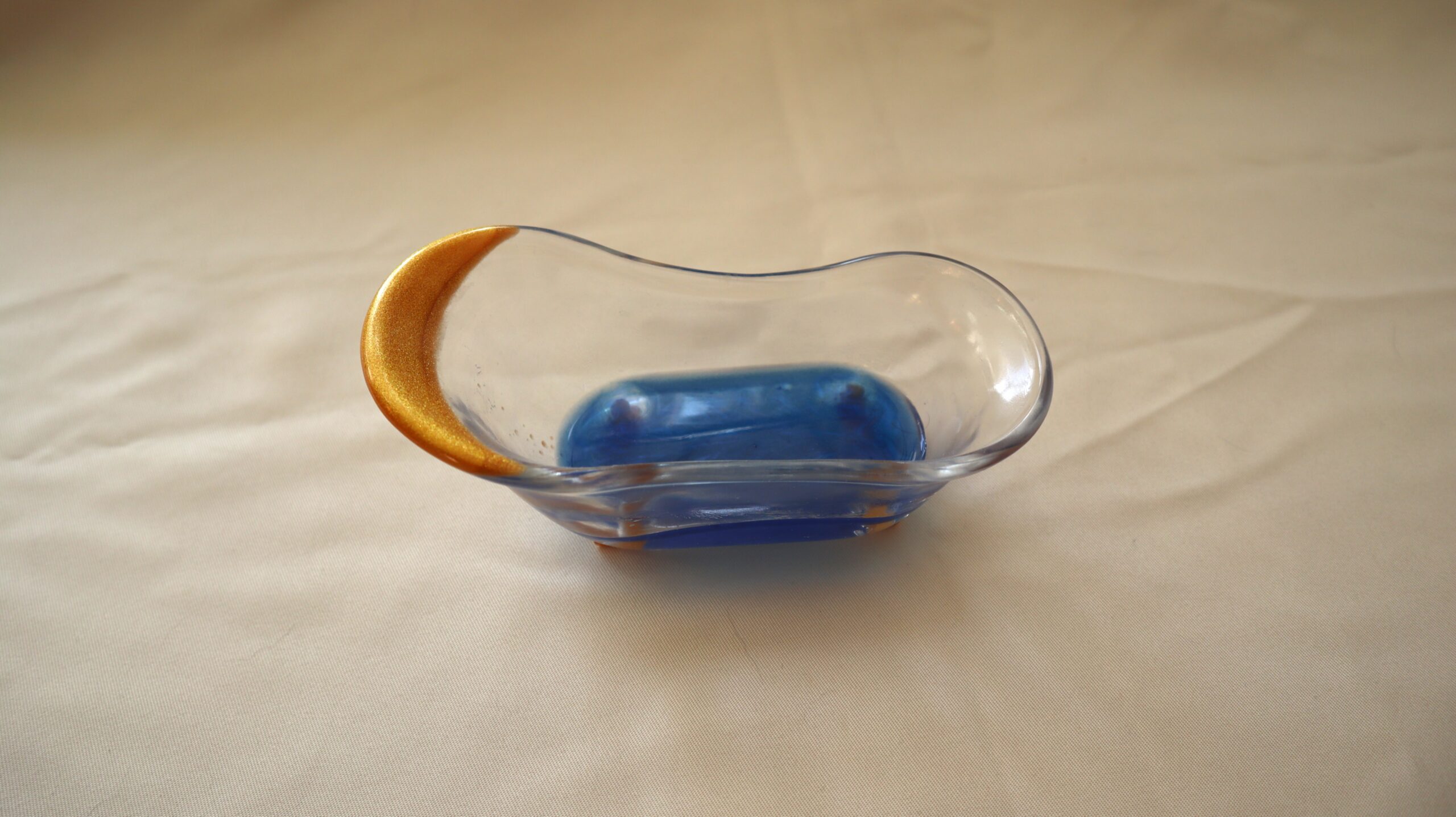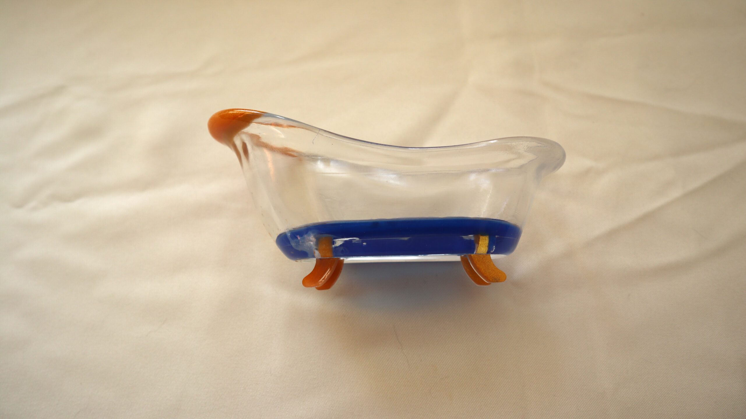 Inspired by the classic shape of a bathtub, this mini decorative piece is handmade from resin and finished in a mix of transparent, gold and blue. Perfect for storing keys, coins or small everyday objects, it brings a touch of color and personality to any space.