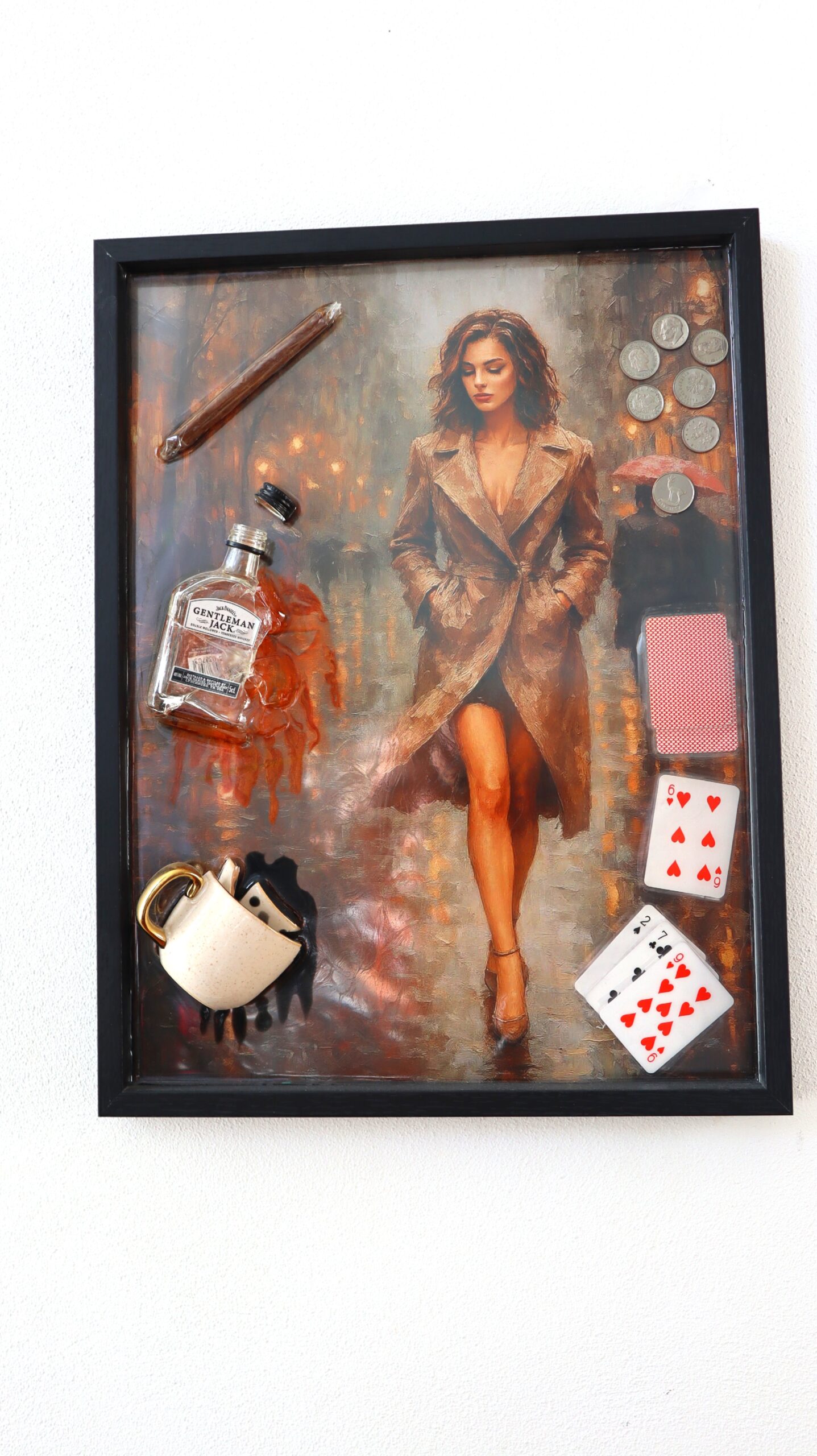 This statement painting combines painting with object art, resulting in an expressive and provocative piece. The central image – an elegant woman, captured in a cinematic, mysterious atmosphere – is complemented by real objects integrated into epoxy: playing cards, coins, a glass, a miniature bottle, a cigar and a padlock.