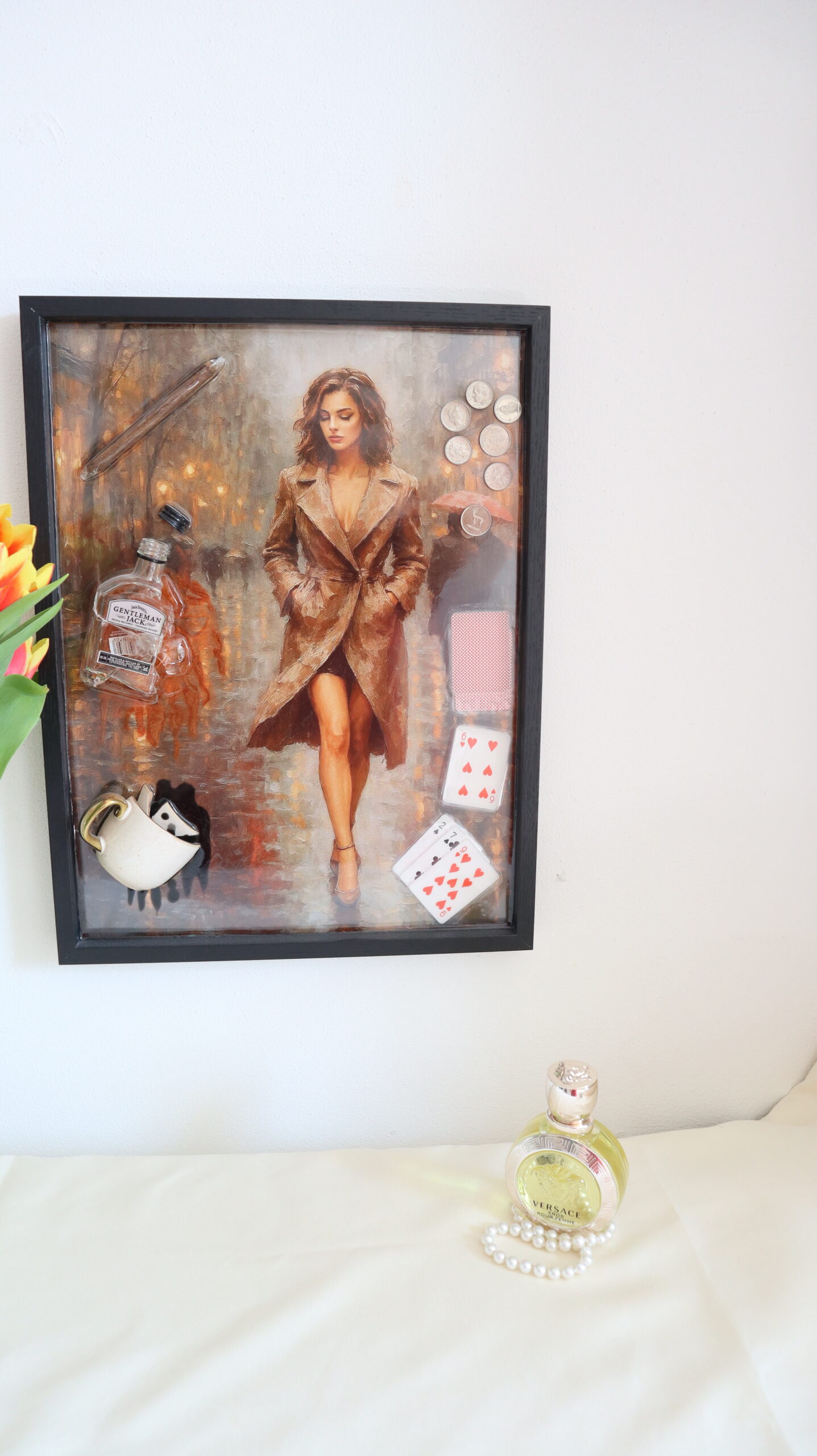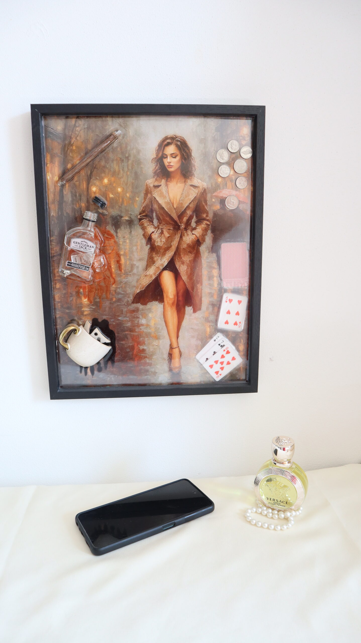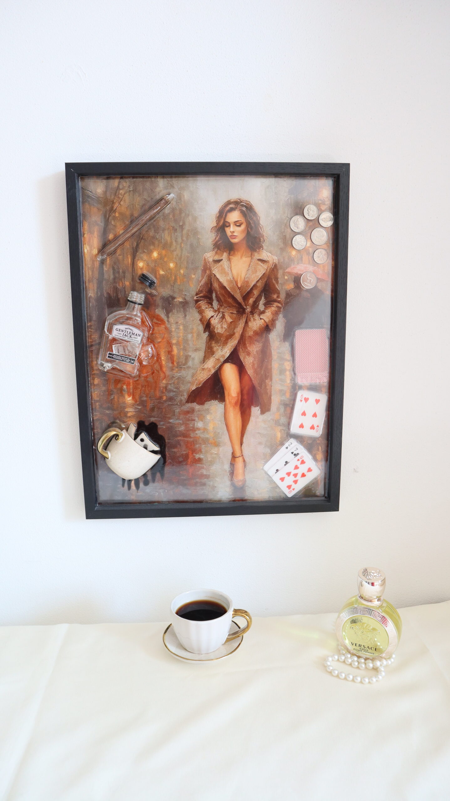 This statement painting combines painting with object art, resulting in an expressive and provocative piece. The central image β an elegant woman, captured in a cinematic, mysterious atmosphere β is complemented by real objects integrated into epoxy: playing cards, coins, a glass, a miniature bottle, a cigar and a padlock.