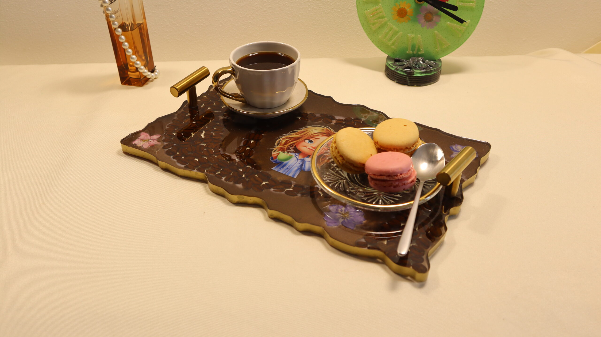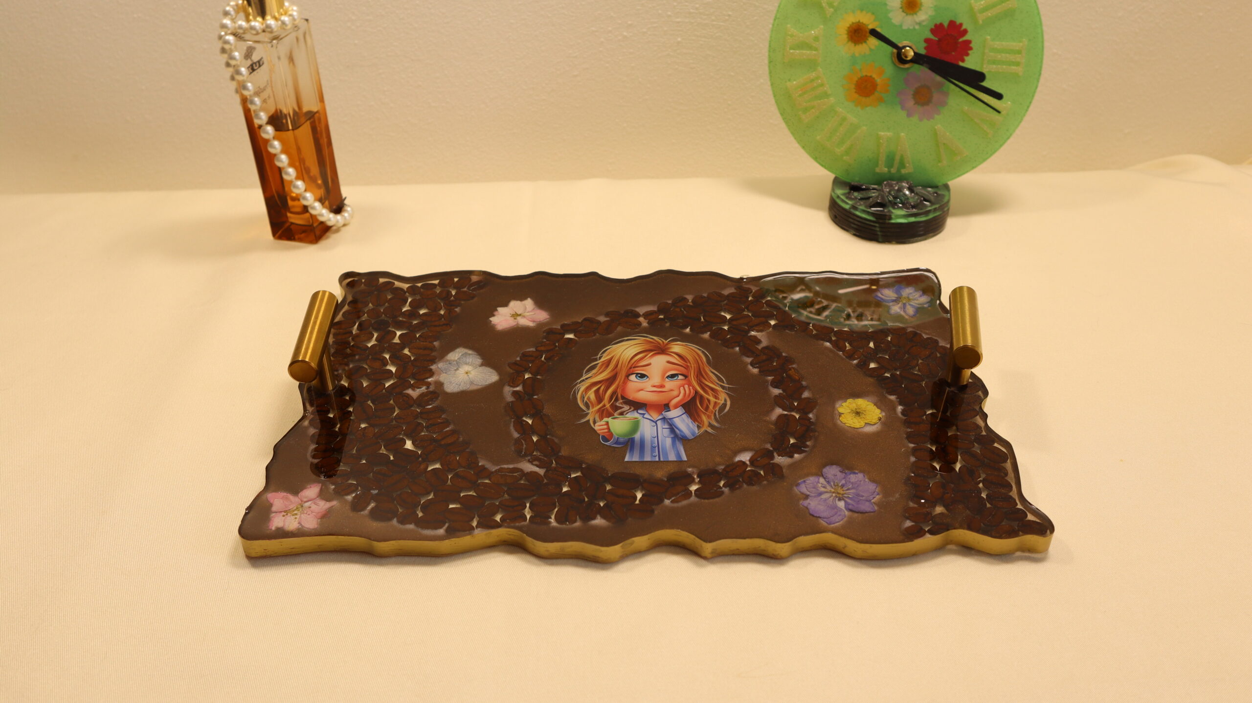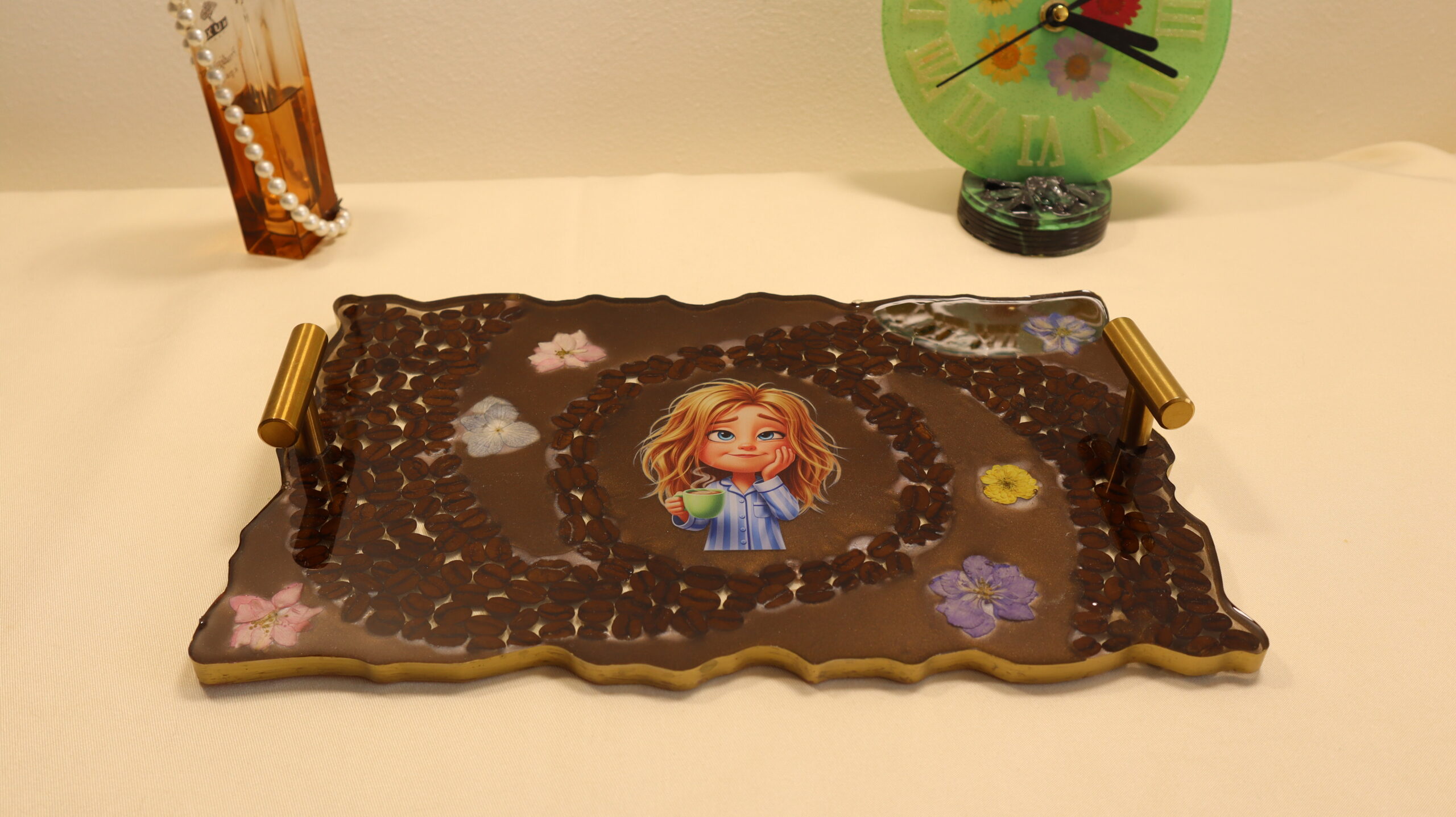 This unique epoxy resin tray is handmade and harmoniously combines natural coffee beans with delicate flowers for a warm and relaxing design. In the center of the tray is an adorable illustration, which conveys a state of tranquility and pampering, perfect for coffee lovers and cozy moments.
