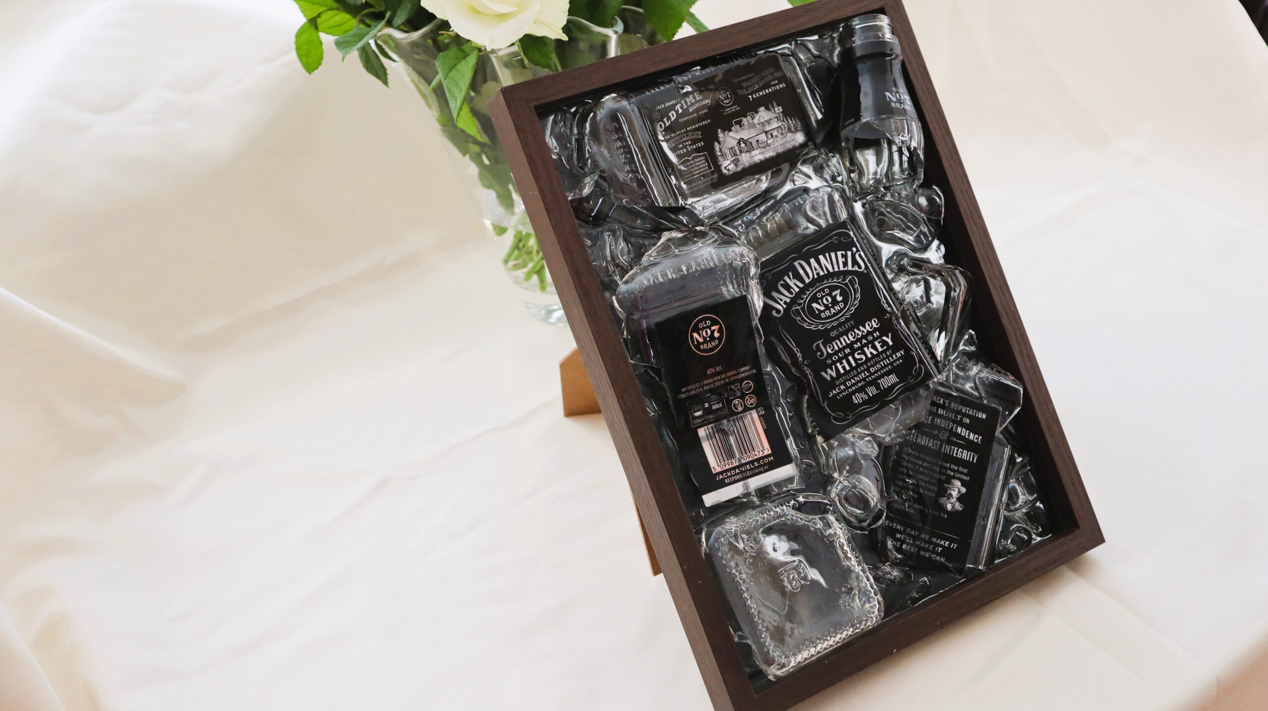 The labels, cork and shards are suspended in a play of transparencies and reflections, like a memory broken into pieces, but preserved forever. The warm, amber and transparent tones evoke the depth of whiskey and the passage of time, while the gloss of the epoxy fixes the moment between full and empty, between tradition and transformation.