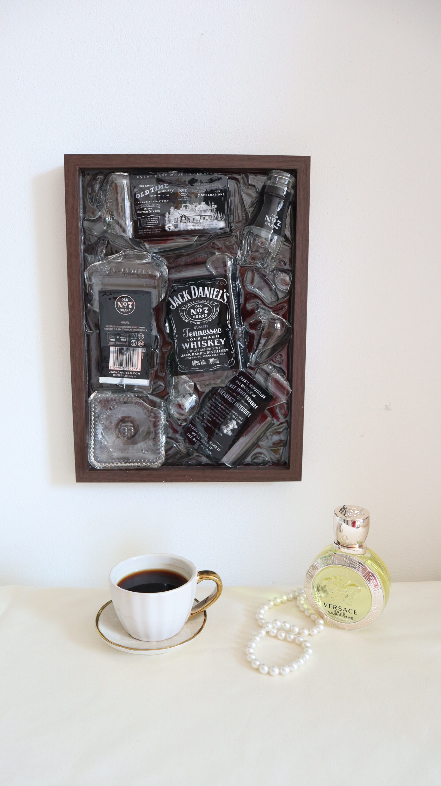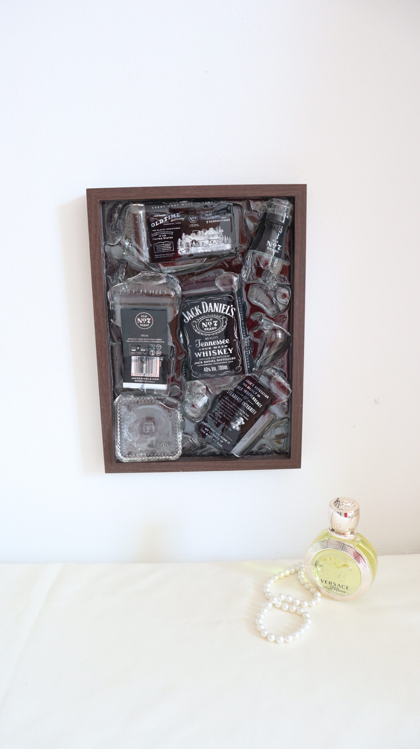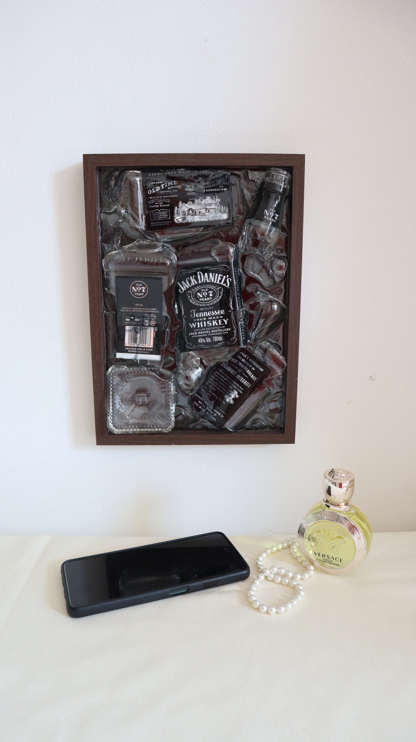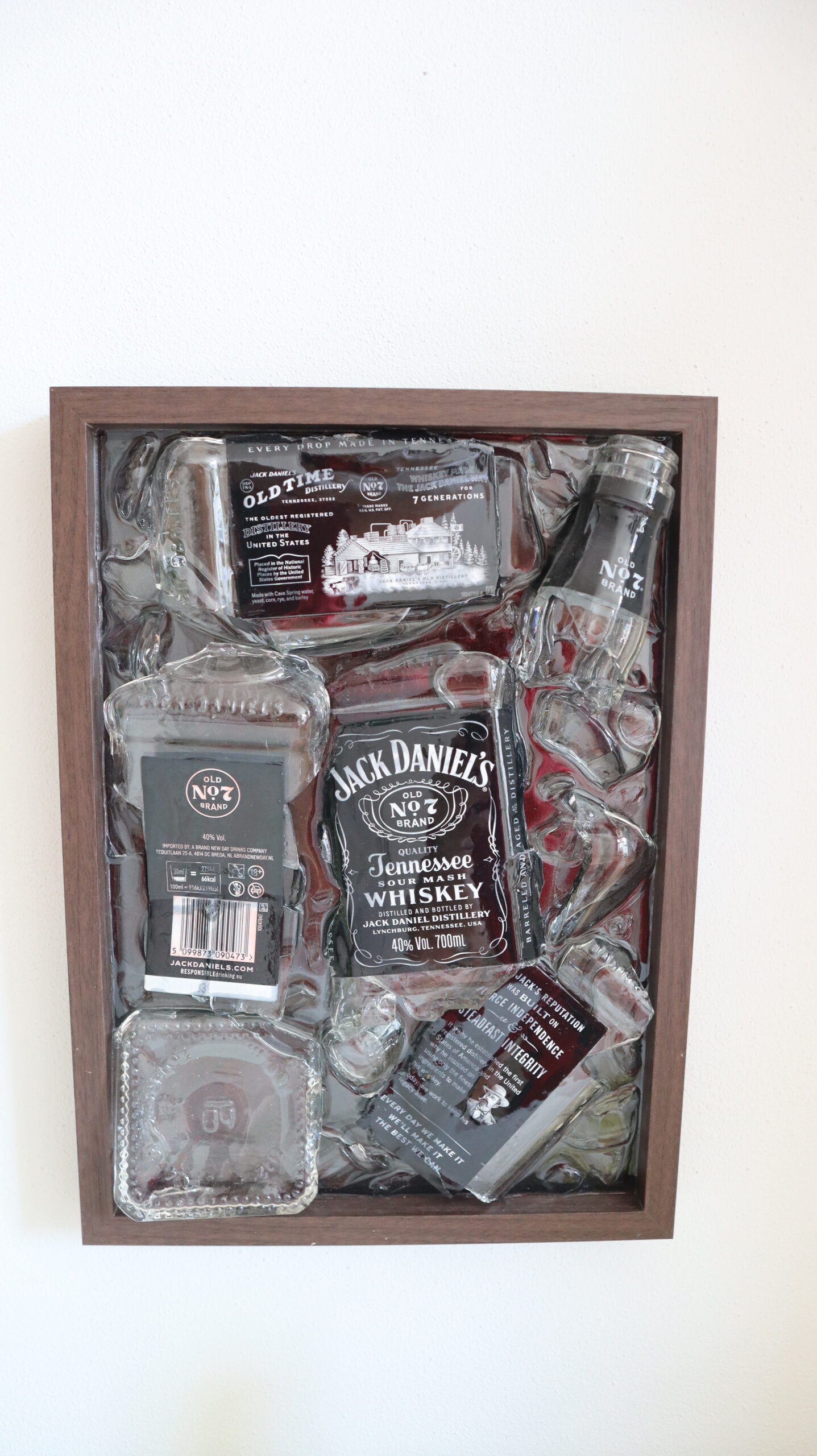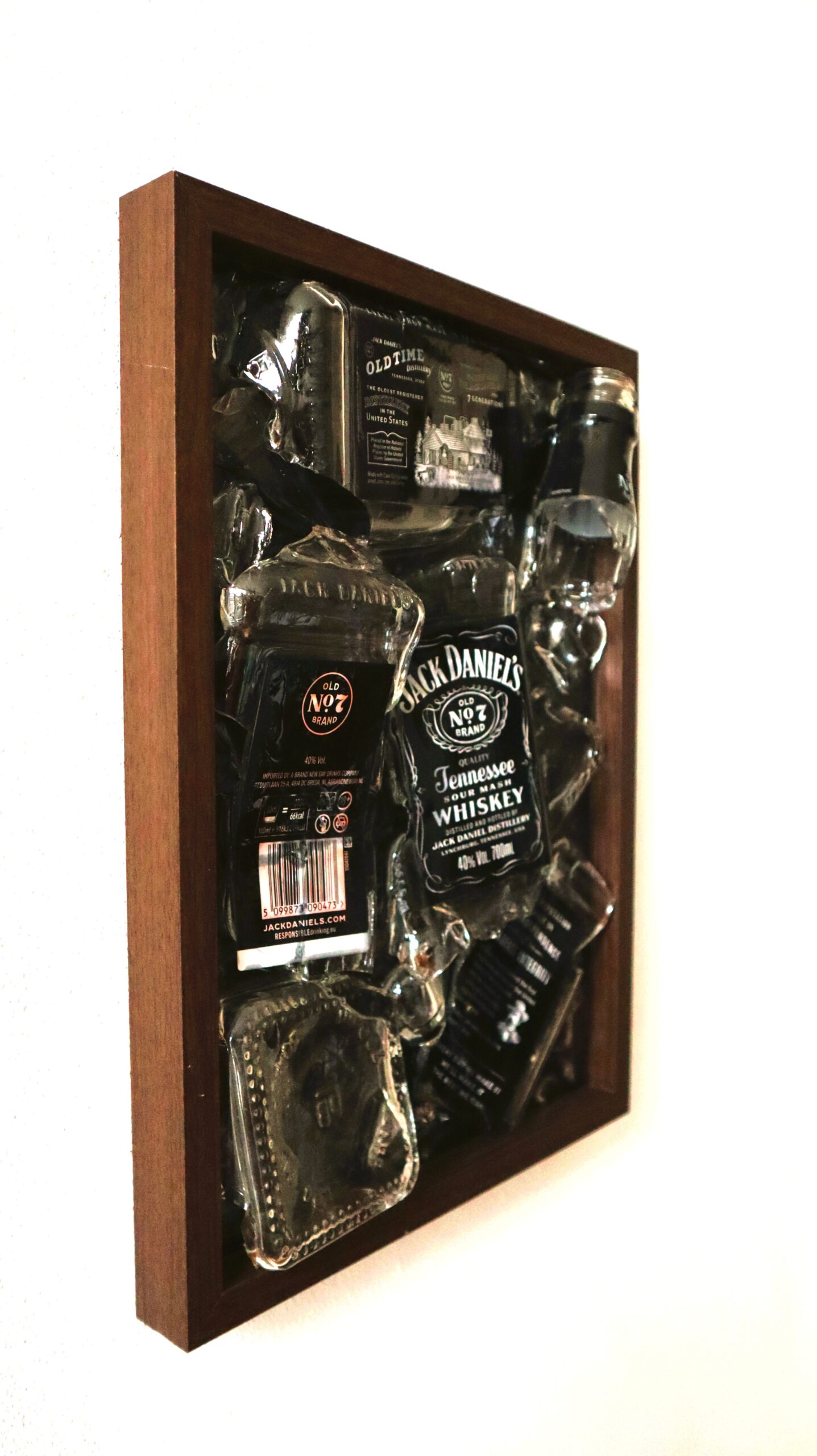 This painting captures the essence of a classic story, reinterpreted through contemporary art. Made of epoxy resin and authentic fragments from a small whiskey bottle, the work preserves the identity of an iconic symbol, but decomposes it to reveal its inner strength.