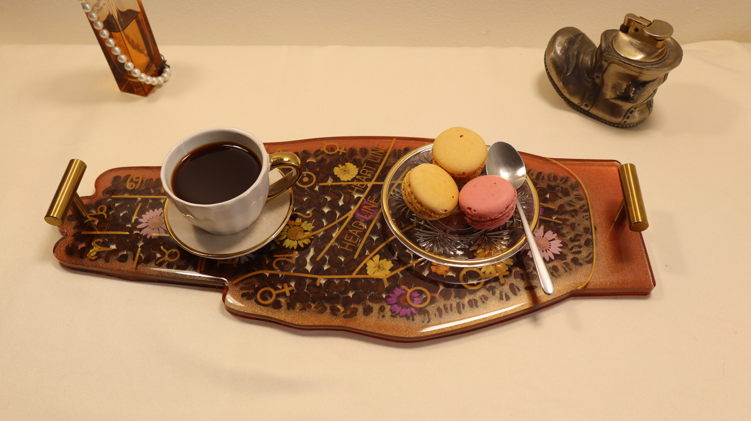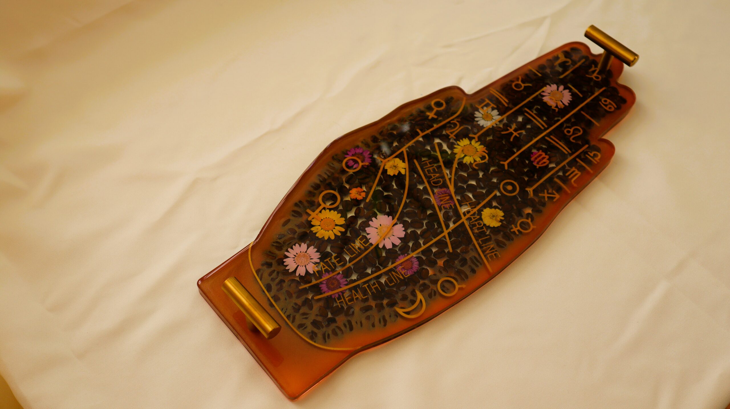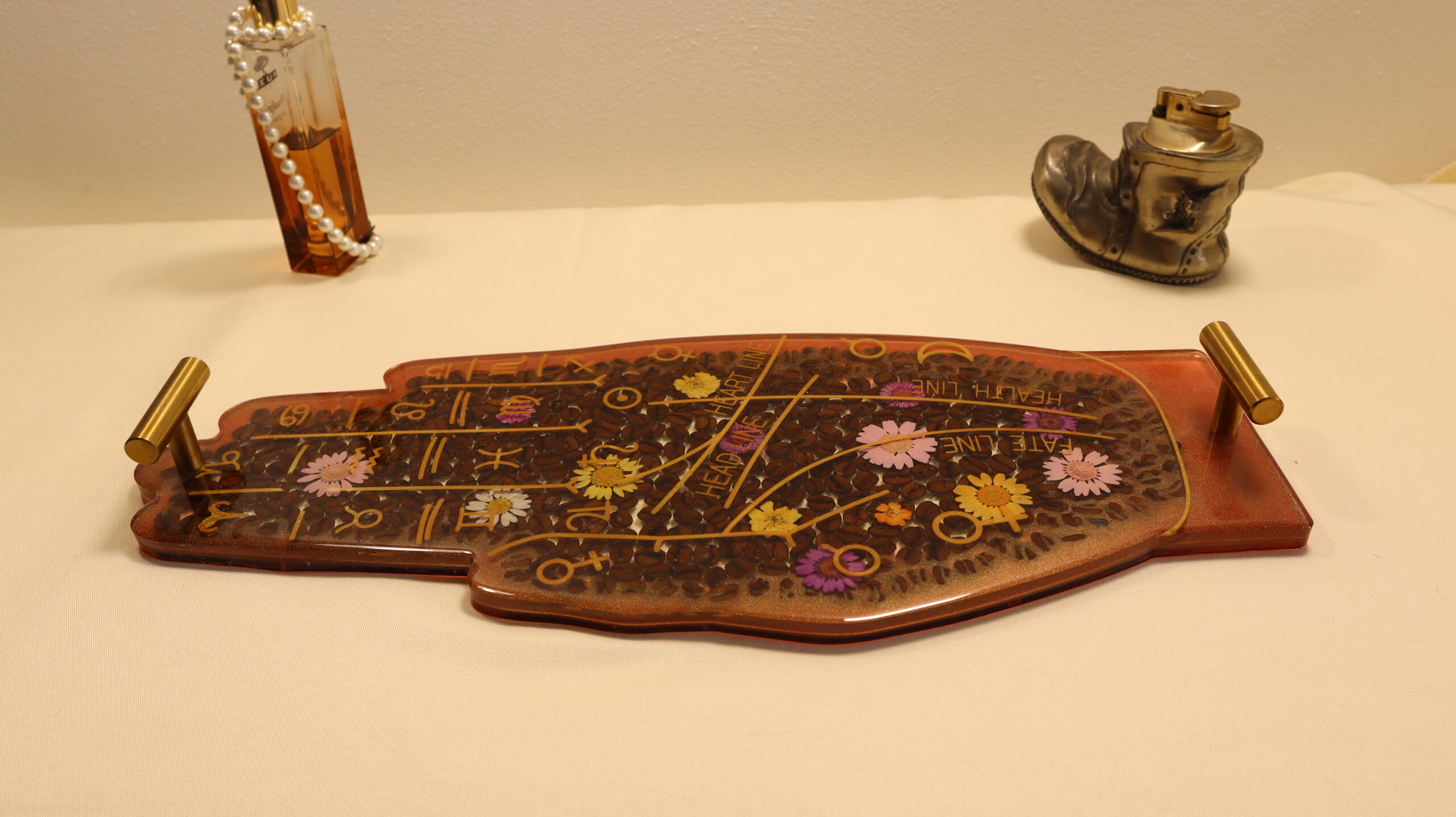 Handmade decorative tray made of epoxy resin, with natural coffee beans, pressed flowers and mystical symbols inspired by palmistry and astrology. The background in warm shades of amber and copper creates an elegant and profound atmosphere, highlighting the golden details and botanical elements.