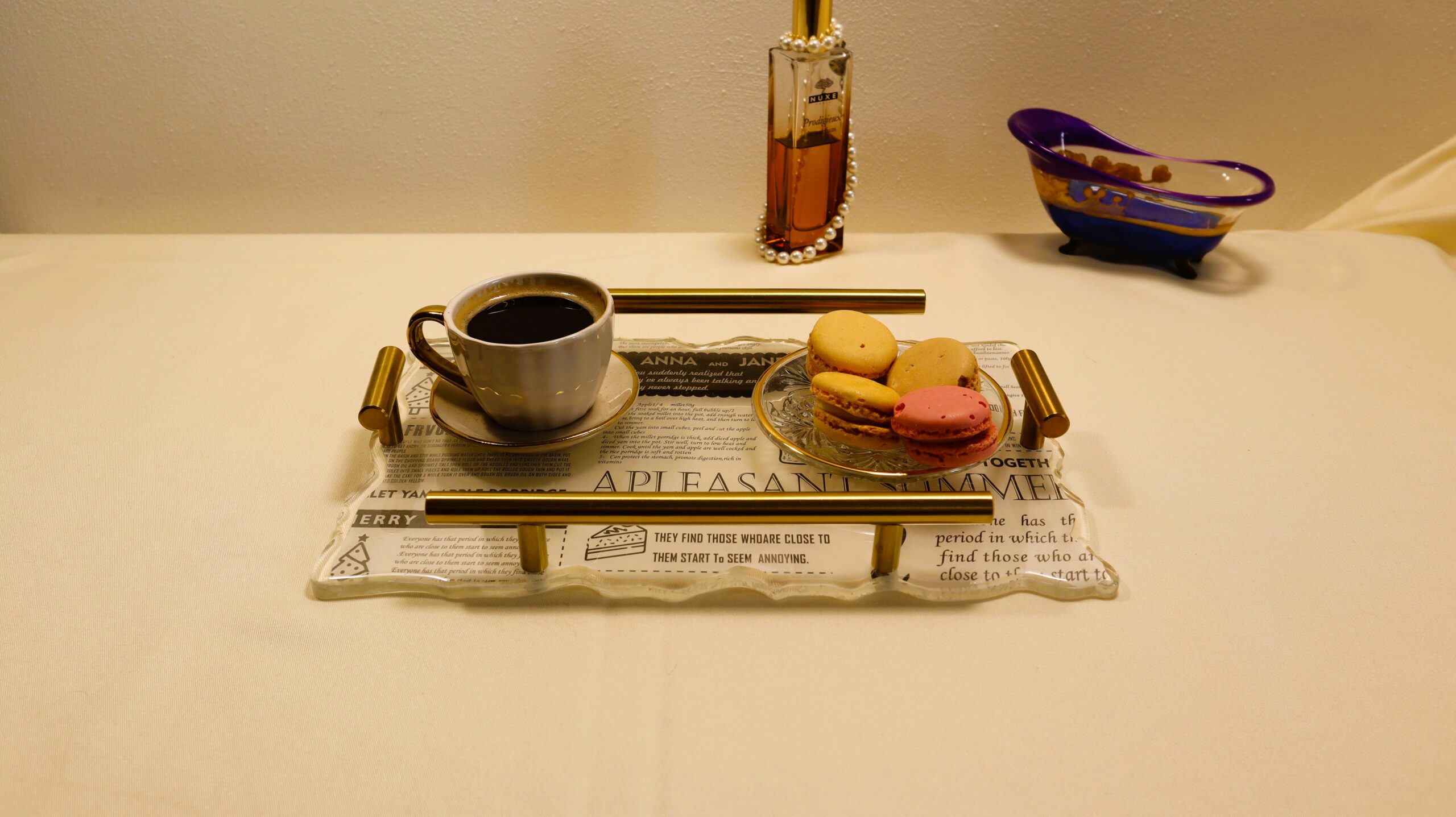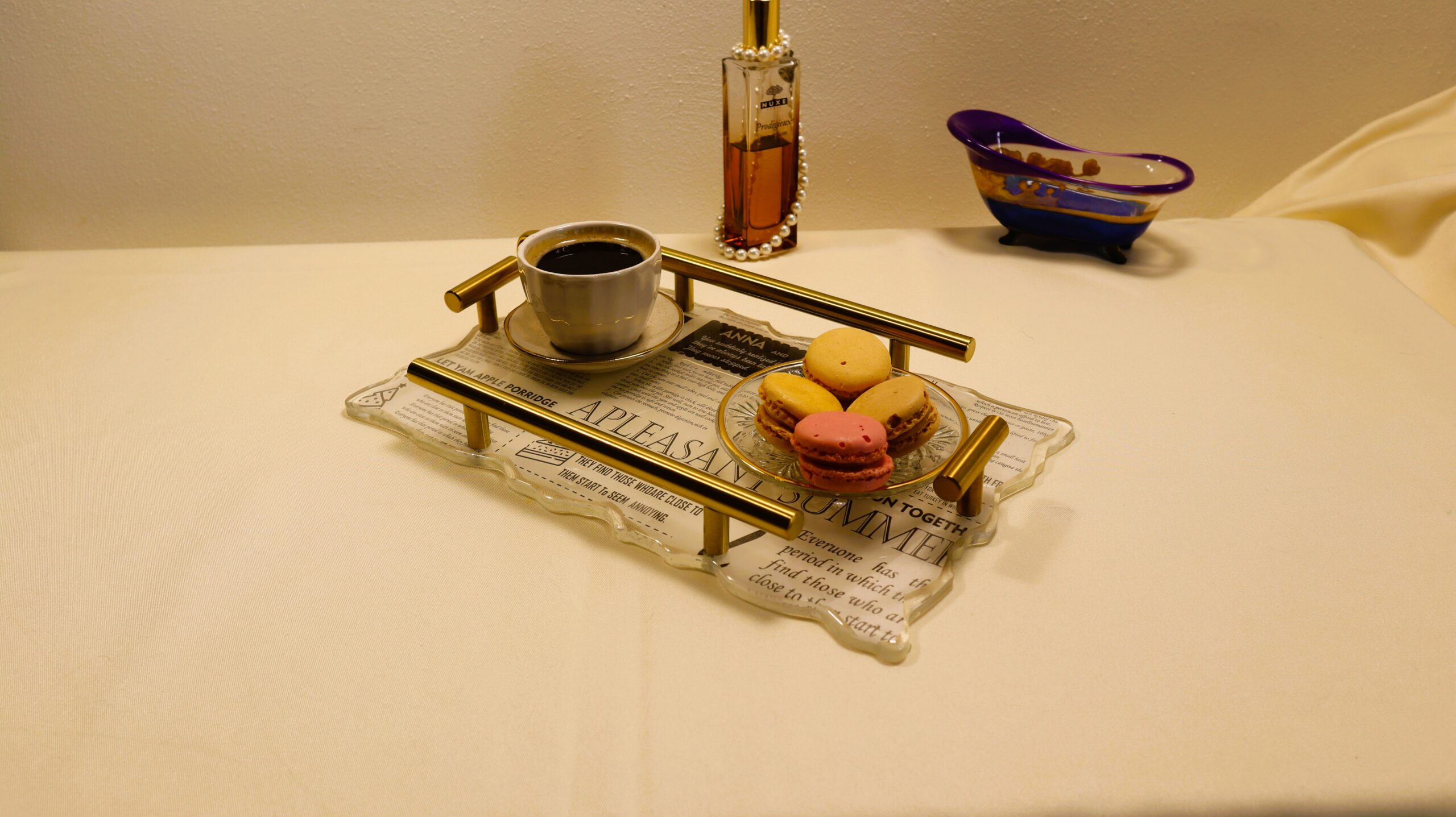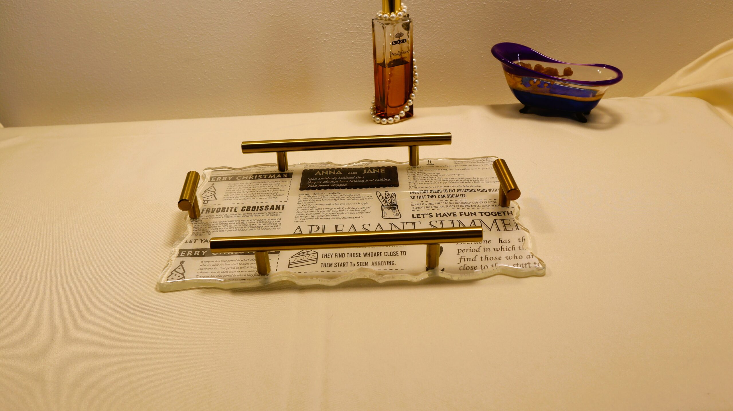 Decorative tray handmade from transparent epoxy resin, with carefully encapsulated newspaper insert, which creates a modern contrast between the printed text and the glossy finish. The gold metal handles provide an extra touch of refinement and make the tray easy to use.