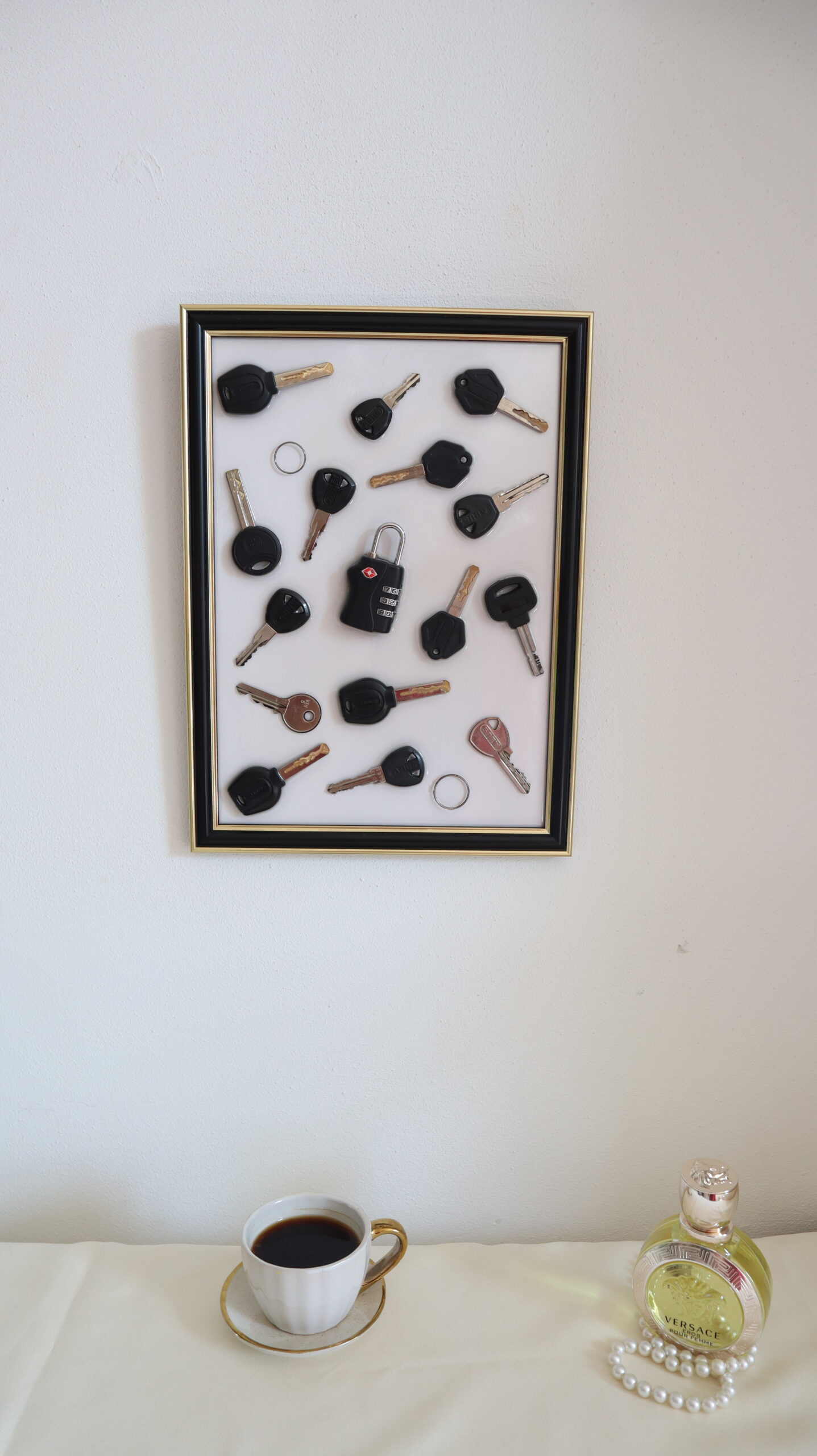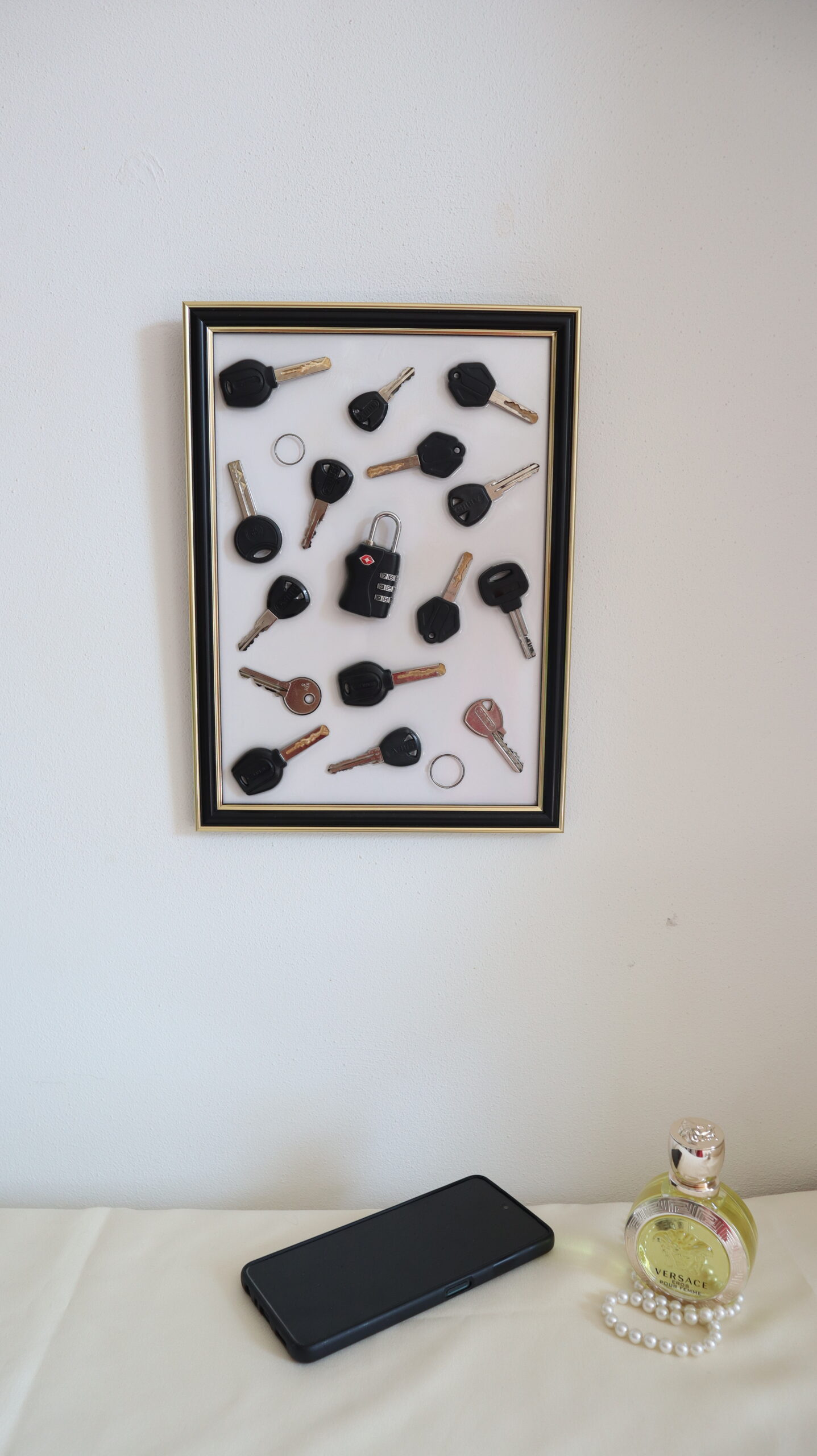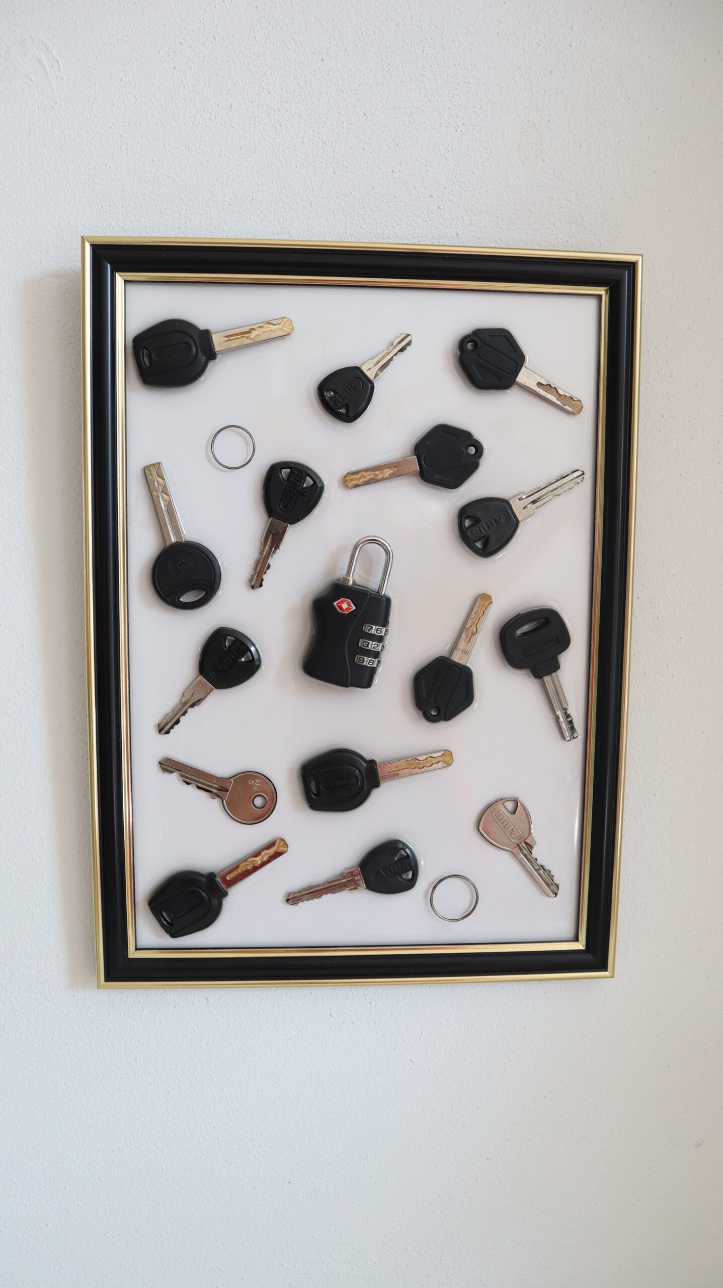 This conceptual painting is handmade and transforms everyday objects into an artistic composition with deep meaning. Real keys and a combination lock are carefully integrated into a minimalist design, with a light background and an elegant frame, creating a strong contrast between the functional and the symbolic.