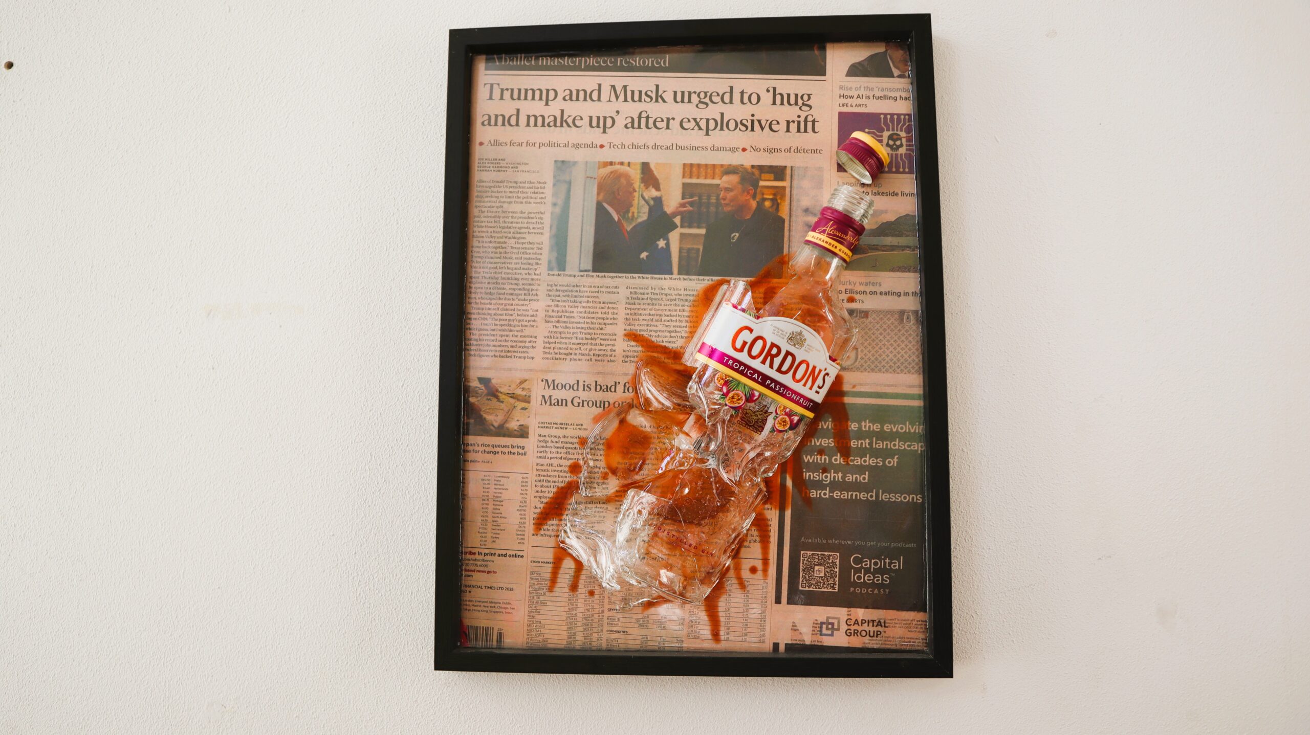 This painting is a piece of contemporary art with visual and conceptual impact, made using mixed media and finished with epoxy. The background is built from newspaper pages, suggesting the informational noise, current events and the influence of the media, over which a real, broken bottle is integrated, captured in a moment of tension and contrast.